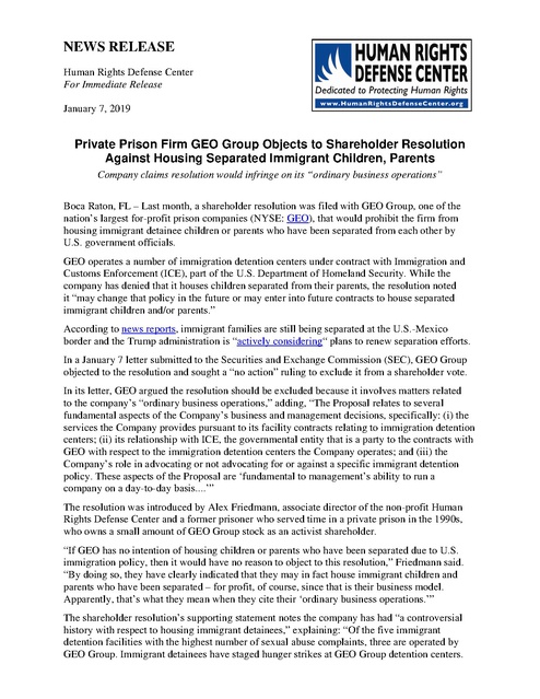 The GEO Group shareholder resolution is posted here. The Human Rights Defense Center is currently running a GoFundMe campaign to cover the cost of contacting shareholders about the resolution if it makes it through the SEC’s review process.