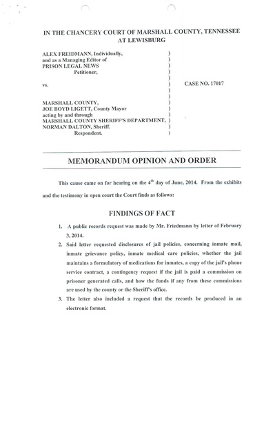 Friedman v. Marshall County, Order Granting Public Records Request 2014