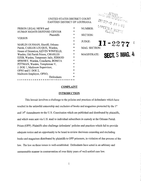 Prison Legal News v. Gusman, LA, Complaint, censorship, 2011