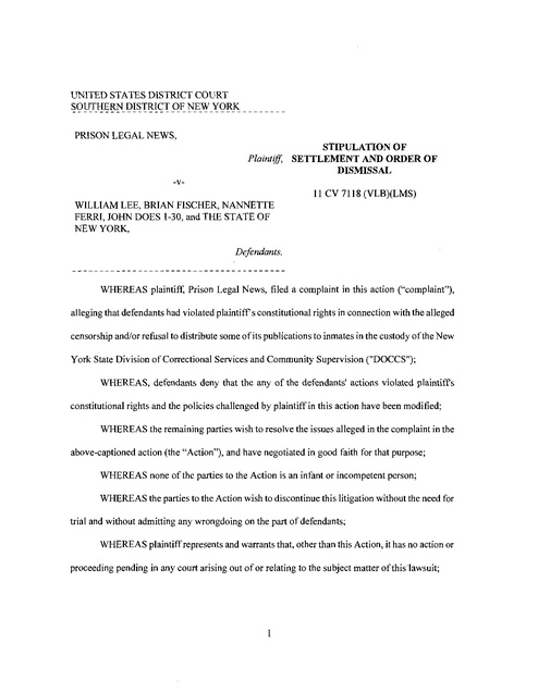 Prison Legal News v. Lee et al., NY, Stip of Settlement, mail censorship, 2012