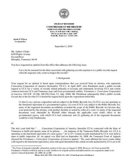 STATE OF TENNESSEE COMPTROLLER OF THE TREASURY OFFICE OF OPEN RECORDS COUNSEL James K. Polk State Office Building 505 Deaderick Street, Suite 1600 Nashville, Tennessee 37243-1402 Justin P. Wilson Comptroller September 3, 2010 Mr. Andrew Clarke 6250 Poplar Avenue Second Floor Memphis, Tennessee 38119 You have requested an opinion from this office that addresses the following issue: Can a fee be assessed for the labor associated with gathering records responsive to a public records request when the requestor only wants to inspect the records? I. Background Your request for an opinion is based upon correspondence that you received from an attorney who represents Corrections Corporation of America (hereinafter “CCA”). In April 2007, Alex Friedmann made a public records request to CCA for a variety of records related primarily to lawsuits and settlements involving CCA and certain contracts between CCA and Tennessee state and local governmental entities. Friedmann v. Corrections Corporation of America, 310 S.W. 3d 366, 369-370 (Tenn. Ct. App. 2009). Mr. Friedmann subsequently filed a public records lawsuit due to the fact that CCA denied his request based upon the corporations belief that: (1) that it was a private corporation and not subject to the Public Records Act; (2) CCA was not operating as the functional equivalent of a governmental agency; (3) even if CCA was subject to the Public Records Act, many of the requested documents nevertheless exceeded the scope of the Public Records Act because they were protected by the attorney work product doctrine or sealed by order of a court; (4) many of the requested documents were obtainable by Plaintiff either through the applicable court clerk's office or the governmental agency with which CCA had contracted; and (5) gathering all of the requested documents would be overly burdensome. Id. The trial court held that “ . . . Corrections Corporation of America (hereafter CCA) contracted with the State of Tennessee to build and operate some of its prisons . . . for purposes of the Tennessee Public Records Act, CCA is operating as the functional equivalent of a state agency.” Id. at 371. Certain records maintained by CCA were held to open to public inspection. Id. An appeal was filed and on September 16, 2009, the Tennessee Court of Appeals released the Friedmann v. Corrections Corporation of America opinion. 1 The court affirmed the lower courts ruling with regard to the functional equivalency issue and again determined that certain records maintained by CCA are to be 1 The Court of Appeals originally released an opinion in this case on August 5, 2009. However, the Court granted Mr. Friedmann’s Petition to Rehear and as a result, withdrew its original opinion and addressed the new arguments made in the opinion released September 16, 2009. Id. at 368. Phone (615) 401-7891 ● Fax (615) 741-1551 ● E-mail open.records@tn.gov September 3, 2010 Page 2 of 3 open to inspection. Id. at 380. The case was remanded to the lower court for a determination as to whether or not any of the requested records do not constitute “public records” and whether or not any of the requested records are confidential because they constitute attorney-client privilege communications or attorney work product. Id. at 381. Based upon the correspondence between the attorney representing Mr. Friedmann and the attorney representing CCA (Attached “Exhibit 1” and “Exhibit 2”), it appears that significant discussion has taken place regarding Mr. Friedmann’s ability to inspect certain of the requested records; however, it also appears that CCA is taking the position that it will only make those records available for Mr. Friedmann’s inspection if he agrees “to cover CCA’s production costs in excess of one hour.”2 II. Analysis When the Tennessee Public Records Act (hereinafter referred to as the “TPRA”) was amended in 2008 with the passage of Public Chapter 1179, Acts of 2008 (Attached “Exhibit 3”), several significant changes were made. First, the General Assembly declared through language that is clear and unambiguous that “A records custodian may not . . . assess a charge to view a public record unless otherwise required by law.” Tenn. Code Ann. Section 10-7503(a)(2)(7)(A). Additionally, this office was established pursuant to Tenn. Code Ann. Section 8-4-601 et. seq. Tenn. Code Ann. Section 8-4-604 directed the office to establish the Schedule of Reasonable Charges. The provision reads in part: (a) The office of open records counsel shall establish: (1) A schedule of reasonable charges which a records custodian may use as a guideline to charge a citizen requesting copies of public records pursuant to Title 10, Chapter 7, Part 5. Tenn. Code Ann. Section 8-4-604. As is clearly indicated by the language of this provision, the Schedule of Reasonable Charges is only applicable when copies or duplicates or records are requested. Tenn. Code Ann. Section 10-7-503 was amended to address how fees for copies of records could be assessed until the Schedule of Reasonable Charges was developed. When passed, Tenn. Code Ann. Section 10-7-503(a)(2)(C) read: (i) Until the office of open records counsel develops a schedule of reasonable charges in accordance with § 8-4-604(a), a records custodian may require a requestor to pay the custodian's actual costs incurred in producing the requested material; provided that no charge shall accrue for the first five (5) hours incurred by the records custodian in producing the requested material. Such actual costs shall include but not be limited to: (a) The making of extracts, copies, photographs or photostats; and (b) The hourly wage of employee(s) reasonably necessary to produce the requested information. (ii) When such schedule of reasonable charges is developed, the provisions of subsection (a)(7)(C)(1) shall become effective. (iii) Following the development of the schedule of reasonable charges by the office of open r