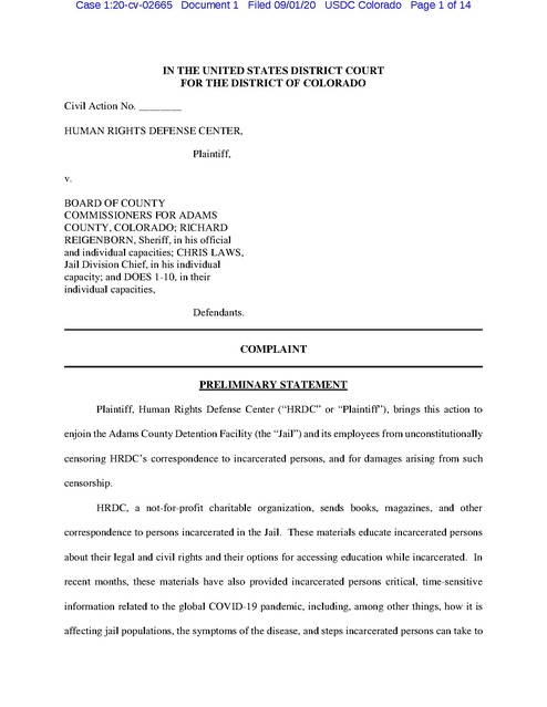 HRDC v. Board of County Commissioners for Adams County, Colorado, et. al, CO, Censorship, Complaint, 2020