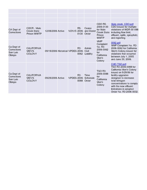 CA Dept of Corrections Ca Dept of Corrections San Luis Obispo Ca Dept of Corrections San Luis Obispo CDCR - Mule Creek State Prison WWTP CALIFORNIA MEN'S COLONY CALIFORNIA MEN'S COLONY CDO R52006-0130 R5- Cease for Mule 12/08/2006 Active NON15 2006- and Desist Creek State 0130 Order Prison WWTP MMP Complaint No. R3R3- Admin 2006-0062 09/19/2006 Historical NPDES 2006- Civil for 0062 Liability California Men's Colony 09/29/2006 Active TSO R32006-0088 R3- Time for NPDES 2006- Schedule California 0088 Order Men's Colony Mule creek_CDO.pdf CDO issued for multiple violations of WDR 00-088 including flow limit, effluent, spills, sprayfield, and reporting 0062.pdf MMP Complaint No. R32006-0062 for California Men's Colony issued for violations that occurred between July 1, 2005 and June 30, 2006. CMC TSO.pdf TSO R3-2006-0088 for California Men's Colony issued on 9/29/06 for facility upgrades designed to decrease total nitrogen concentrations to comply with the new effluent limitations in adopted Order No. R3-2006-0032.