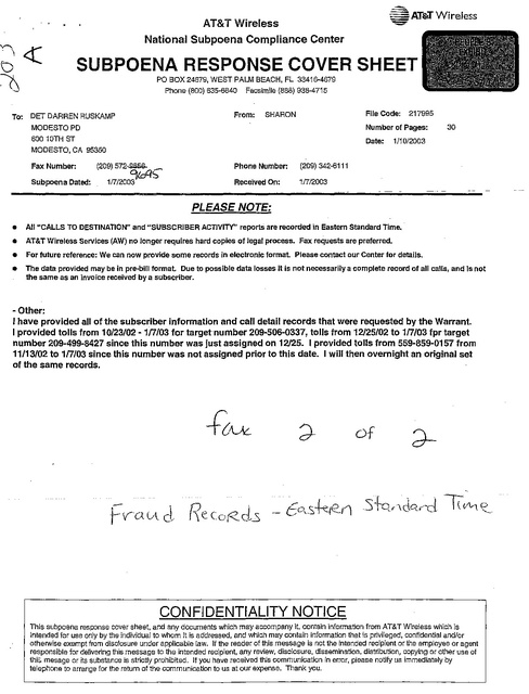 - ~AT&T AT&T Wireless '='" Wireless National Subpoena Compliance Center SUBPOENA RESPONSE COVER SHEET PO BOX 24679, WEST PALM BEACH, FL 33416-4679 Phone (800) 635-6840 Facsimile (888) 938-4715 To: From: DET DARREN RUSKAMP File Code: SHARON 217995 MODESTOPD Number of Pages: 600 10TH ST Date: 30 1/10/2003 MODESTO, CA 95350 Fax Number: Subpoena Dated: (209) 572-.9S5e- ...... <jtdl~ 1/7/2003 Phone Number: (209) 342-6111 Received On: 1/7/2003 PLEASE NOTE: • All "CALLS TO DESTINATION" and "SUBSCRIBER ACTIVITY" reports are recorded in Eastern Standard Time. • AT&T Wireless Services (AW) no longer requires hard copies of legal process. Fax requests are preferred. • For future reference: We can now provide some records in electronic format. Please contact our Center for details. • The data prOVided may be in pre-bill format. Due to possible data losses it is not necessarily a complete record of all calls, and is not the same as an invoice received by a subscriber. - Other: I have provided all of the subscriber information and call detail records that were requested by the Warrant. I provided tolls from 10/23/02 - 1nl03 for target number 209-506-0337, tolls from 12125/02 to 1nl03 fpr target number 209-499-8427 since this number was just assigned on 12125. I provided tolls from 559-859-0157 from 11113/02 to 1nl03 since this number was not assigned prior to this date. I will then overnight an original set of the same records. of CONFIDENTIALITY NOTICE This SUbpoena response cover sheet, and any documents which may accompany it, contain information from AT&T Wireless which is intended for use only by the individual to whom it is addressed, and which may contain information that is privileged, confidential and/or otherwise exempt from disclosure under applicable law. If the reader of this message is not the intended recipient or the employee or agent responsible for delivering this message to the intended recipient, any review, disclosure, dissemination, distribution, copying or other use of thiil; mesage or its substance is strictly prohibited. If you have received this communication in error, please notify us immediately by telephone to arrange for the return of the communication to us at our expense. Thank you. ---------- -J • ... _ ............ .:/ SUB S C RIB E R Subser±ber Number: Auth MtoM 46 47 48 49 50 51 52 53 54 55 56 57 58 59 60 61 62 63 64 65 66 67 68 69 70 71 72 73 74 75 76 77 78 79 BO Bl 82 83 84 85 86 87 8B B9 90 91 92 93 94 95 96 97 98 99 100 101 102 103 Y y y y Y Y y y y y y y Y y y y y y y y y y Y Y y y Y y y y y y y y y y y y Y y y y Y Y y y y y y .y y y y y y y y Y ACTIVITY 2095050337 Call Date 01/07/2003 01/07/2003 01/07/2003 01/07/2003 01/07/2003 01/07/2003 01/07/2003 01/07/2003 01/07/2003 01/07/2003 01/07/2003 01/07/2003 01/07/2003 01/07/2003 01/07/2003 01/07/2003 01/07/2003 01/07/2003 01/07/2003 01/07/2003 01/07/2003 01/07/2003 01/07/2003 01/07/2003 01/07/2003 01/07/2003 01/07/2003 01/07/2003 01/07/2003 01/07/2003 01/07/2003 01/07/2003 01/07/2003 01/07/2003 01/07/2003 01/07/2003 01/07/2003 01/07/2003 01/07/2003 01/07/2003 01/07/2003 01/07/2003 01/07/2003 01/07/2003 01/07/2003 01/07/2003 01/07/2003 01/07/2003 01/07/2003 01/07/2003 01/07/2003 01/07/2003 01/07/2003 01/07/2003 y 01/07/2003 y y y 01/07/2003 01/07/2003 01/07/2003 Printed: Call Time 11:25:28 11:25:28 11:25:28 10:24:12 10:24:12 10:22:42 10:22:42 10:22:42 10:18:17 10:18:17 10:09:44 10:09:44 10:09:07 10:08:31 OB:55:53 OB:55:36 08:54:28 OB:54:2B OB:54:28 08:54:19 OB:54:04 08:52:43 08:45:34 08:45:34 08:43:28 08:43:28 07:33:54 07:33:54 07:02:44 07:00:47 06:58:4B 06:52:50 06:52:50 06:52:50 06:52:1B 06:52:18 06:28:00 06:28:00 05:57:42 05:51:20 05:30:45 05:28:55 04:3B:04 04:27:22 04:21:2B 04:13:50 02:02:24 01:45:52 01:44:43 01:40:36 01:39:26 01:39:03 12:40:11 12:36:14 12:34:50 12:34:05 12:33:40 12:26:56 PM PM PM PM PM PM PM PM PM PM PM PM PM PM PM PM PM PM PM PM PM PM PM PM PM PM PM PM PM PM PM PM PM PM PM PM PM PM PM PM PM PM PM PM PM PM PM PM PM PM PM PM PM PM PM PM PM PM Type Cov Inc LeI LeI Inc LeI Inc LeI LeI Inc LeI Inc LeI Inc Inc LeI LeI Inc LeI LeI LeI LeI Nt'l Inc LeI Inc LeI Inc LeI LeI LeI Nt'l Inc LeI LeI Inc LeI Inc LeI Inc Inc Le1 LeI LeI LeI Inc Inc Inc Inc Inc LeI LeI LeI Nt'l LeI LeI Nt'l Nt'l Inc H H H H H H H H H H H H H H H H H H H H H H H H H H H H H H H H H H H H H H H H H H H H H H H H H H H H H H H H H H 01/08/03 Dial.#/Loea2 209-505-0337 209-505-0337 209-505-0337 209-505-0337 209-505-0337 209-505-0337 209-505-0337 1-209-985-0233 522-1165 209-505-0337 ,209-505-0337 522-1165 404-9998 1-619-204-7166 209-505-0337 209-505-0337 209-505-0337 411 411 1-619-204-7166 209-505-0337 209-505-0337 209-505-0337 209-505-0337 578-0334 411 1-209-604-4417 411 531-6476 575-4844 575-4484 510-268-9204 575-4844 668-0488 510-268-9204 510-268-9204 05:57:36 PM Duration 00:00:00:32 00:00:00:32 00:00:00:32 00:00:00:37 00:00:00:37 00:00:00:51 00:00:00:51 00:00:00:51 00:00:00:00 00:00:00:00 00:00:01:21 00:00:01:21 00:00:00:08 00:00:00:08 00:00:00:22 00:00:00:00 00:00:00:57 00:00:00:57 00:00:00:57 00:00:00:00 00:00:00:01 00:00:00:58 00:00:00:27 00:00:00:27 00:00:00:30 00:00:00:30 00:00:00:26 00:00:00:26 00:00:08:26 00:00:01:39 00:00:01:17 00:00:00:24 00:00:00:24 00:00:00:24 00:00:00:03 00:00:00:03 00:00:00:37 00:00:00:37 00:00:00:23 00:00:05:25 00:00:01:38 00:00:00:56 00:00:01:13 00:00:04:40 00:00:03:38 00:00:00:35 00:00:03:05 00:00:06:21 00:00:00:35 00:00:00:30 00:00:00:55 00:00:00:00 00:00:02:28 00:00:03:42 00:00:00:15 00:00:00:01 00:00:00:04 00:00:00:17 EndOfCal1 11:26:00 11:26:00 11:26:00 10:24:49 10:24:49 10:23:33 10:23:33 10:23:33 10:18:17 10:18:17 10: 11: 05 10:11:05 10:09:15 10:08:39 OB:56:15 08:55:36 OB:55:25 08:55:25 OB:55:25 08:54:19 OB:54:05 08:53:41 08:46:01 08:46:01 08:43:58 08:43:58 07:34:20 07:34:20 07:11:10 07:02:26 07:00:05 06:53:14 06:53:14 06:53:14 06:52:21 06:52:21 06:28:37 06:28:37 05:58:05 05:56:45 05:32:23 05:29:51 04:39:17 04:32:02 04:25:06 04:14:25 02:05:29 01:52:13 01:45:18 01:41:06 01:40:21 01