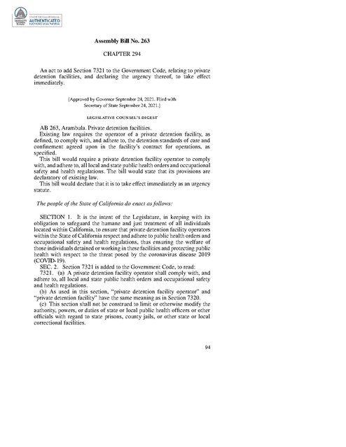 STATE OF CALIFORNIA AUTHENTICATED ELECTRONIC LEGAL MATERIAL Assembly Bill No. 263 CHAPTER 294 An act to add Section 7321 to the Government Code, relating to private detention facilities, and declaring the urgency thereof, to take effect immediately. [Approved by Governor September 24, 2021. Filed with Secretary of State September 24, 2021.] legislative counsel’s digest AB 263, Arambula. Private detention facilities. Existing law requires the operator of a private detention facility, as defined, to comply with, and adhere to, the detention standards of care and confinement agreed upon in the facility’s contract for operations, as specified. This bill would require a private detention facility operator to comply with, and adhere to, all local and state public health orders and occupational safety and health regulations. The bill would state that its provisions are declaratory of existing law. This bill would declare that it is to take effect immediately as an urgency statute. The people of the State of California do enact as follows: SECTION 1. It is the intent of the Legislature, in keeping with its obligation to safeguard the humane and just treatment of all individuals located within California, to ensure that private detention facility operators within the State of California respect and adhere to public health orders and occupational safety and health regulations, thus ensuring the welfare of those individuals detained or working in these facilities and protecting public health with respect to the threat posed by the coronavirus disease 2019 (COVID-19). SEC. 2. Section 7321 is added to the Government Code, to read: 7321. (a) A private detention facility operator shall comply with, and adhere to, all local and state public health orders and occupational safety and health regulations. (b) As used in this section, “private detention facility operator” and “private detention facility” have the same meaning as in Section 7320. (c) This section shall not be construed to limit or otherwise modify the authority, powers, or duties of state or local public health officers or other officials with regard to state prisons, county jails, or other state or local correctional facilities. 94 Ch. 294 —2— (d) This section is declaratory of existing law. SEC. 3. This act is an urgency statute necessary for the immediate preservation of the public peace, health, or safety within the meaning of Article IV of the California Constitution and shall go into immediate effect. The facts constituting the necessity are: In order to protect the health of individuals detained or working in private detention facilities, which are environments shown to be dangerous for the transmission of COVID-19, it is necessary for this act to take effect immediately. O 94