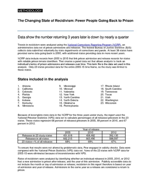 METHODOLOGYI The Changing State of Recidivism: Fewer People Going Back to Prison Data show the number returning 3 years later is down by nearly a quarter Trends in recidivism were analyzed using the National Corrections Reporting Program (NCRP), an administrative data set of prison admissions and releases. The federal Bureau of Justice Statistics (BJS) collects data submitted voluntarily by state departments of corrections and parole. At least 38 states have provided some data going back to 2000, with additional states providing data in more recent years. NCRP data include records from 2000 to 2015 that link prison admission and release records for states with reliable prison inmate identifiers. That creates a panel data set that allows analysts to track an individual’s terms of prison admissions and releases over time. This term file is the data set used in this analysis. Only 23 states provided data for the entire 2005-15 time frame, so the study was limited to these states. States included in the analysis 1. 2. 3. 4. 5. 6. 7. 8. Arizona California Colorado Florida Georgia Indiana Kentucky Minnesota 9. 10. 11. 12. 13. 14. 15. 16. Mississippi Missouri Nebraska New York North Carolina North Dakota Oklahoma Pennsylvania 17. 18. 19. 20. 21. 22. 23. Rhode Island South Carolina Tennessee Texas Utah Washington Wisconsin Because of incomplete state data in the NCRP for the three years under study, the report used the National Prisoner Statistics (NPS) data set to calculate percentages of all released prisoners in the 23 states. These states represent 68 percent of released prisoners in 2005, 69 percent in 2010, and 67 percent in 2012. Releases in 23 study states Releases in all states 23 states—% of all releases 2005 451,618 662,215 68% Year of release 2010 458,482 663,490 69% 2012 392,130 588,597 67% To ensure that results were not altered by problematic data, Pew engaged in validity checks. Data were compared with the National Prison Statistics (NPS) data set. None of the 23 states with NCRP data for 2005-15 were eliminated because of inconsistencies with NPS. Rates of recidivism were analyzed by identifying whether an individual released in 2005, 2010, or 2012 had a new admission to prison after release, and the year of this admission. Publicly accessible data do not include the month or day of admission or release; recidivism in this report therefore is based on year of admission and year of release. Admissions in the same year as a release are considered a return to prison. METHODOLOGYI Differences between the Pew and BJS recidivism studies In the past, BJS has included data on returns to prison in its reports on recidivism of people released in 1994 and 2005. The 2018 report on the 2005 cohort, however, includes only rearrests. For its report, BJS used a sample of approximately 70,000 prisoners (out of over 400,000) released from 30 states that were chosen because their departments of corrections could provide the fingerprint-based identification numbers needed to link the criminal history records to released prisoners. Pew does not have access to individual-level FBI criminal history records and therefore is unable to collect information on rearrests. The BJS study includes only those sentenced to one year or more, whereas Pew has included all released prisoners in each year. Also, NCRP does not capture data on individuals who were released from prison in one state and who may have been incarcerated subsequently in another state. BJS’ access to additional data sources allowed its report to include out-of-state reincarceration data. Additionally, BJS removes from its study individuals who have died, which is information that Pew cannot access. For calculating date of return to prison, Pew used the year of new admission. In the 2014 BJS report on the 2005 cohort, recidivism was calculated based on the date of arrest that led to reincarceration — generally a longer time frame, given the time necessary to adjudicate cases. The BJS study reports the following reincarceration rates: Recidivism of Prisoners Released in 30 States in 2005: Patterns From 2005 to 2010 (BJS, 2014) Time from release to arrest leading to return to prison Return to prison rate 12 mos. 30.4% 24 mos. 43.3% 36 mos. 49.7% 48 mos. 52.9% 60 mos. 55.1% As this table shows, there were only small differences in Pew’s and BJS’ return-to-prison recidivism numbers for the 2005 cohort resulting from these differences of measurement. Understanding the recidivism decline Determining causal relationships to explain the drop in recidivism rates was outside the scope of this analysis. However, Pew wanted to investigate the extent to which differences unrelated to changes in postrelease practices could account for differences in rates of return. This might include differences in the individual characteristics of prisoners, changes in sentence length of those released, or the relative number of releases from each state. Pew used a regression model to control for race, gender, original sentence length, original offense, age at release, and the state with jurisdiction. This analysis showed that being released in 2012, compared with being released in 2005, is associated with a .42 reduction in the log odds of being readmitted to prison by the end of the third year, holding all those variables constant. This can be roughly translated to a 10.5 percentage point reduction in the probability of returning to prison after controlling for these variables, compared with an 11.5 percentage point reduction without these controls. METHODOLOGYI Figure 1 Small Differences in Prisoner Characteristics for Those Released in 2005 and 2012 Offense category, gender, and age for those released in respective years Selected characteristics of prisoners released from 23 states in 2005 and 2012 Original offense Violent Property Drugs Public order Percentage of group Released Released in 2005 in 2012 22.6% 25.6% 30.4% 29.6% 30.9% 26.6% 14.2% 17.1% Diffe