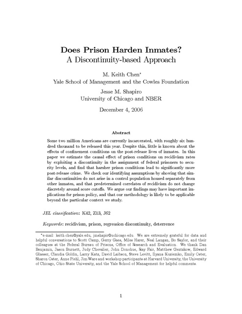Does Prison Harden Inmates? A Discontinuity-based Approach M. Keith Chen∗ Yale School of Management and the Cowles Foundation Jesse M. Shapiro University of Chicago and NBER December 4, 2006 Abstract Some two million Americans are currently incarcerated, with roughly six hundred thousand to be released this year. Despite this, little is known about the effects of confinement conditions on the post-release lives of inmates. In this paper we estimate the causal effect of prison conditions on recidivism rates by exploiting a discontinuity in the assignment of federal prisoners to security levels, and find that harsher prison conditions lead to significantly more post-release crime. We check our identifying assumptions by showing that similar discontinuities do not arise in a control population housed separately from other inmates, and that predetermined correlates of recidivism do not change discretely around score cutoffs. We argue our findings may have important implications for prison policy, and that our methodology is likely to be applicable beyond the particular context we study. JEL classification: K42, Z13, J62 Keywords: recidivism, prison, regression discontinuity, deterrence ∗ e-mail: keith.chen@yale.edu, jmshapir@uchicago.edu. We are extremely grateful for data and helpful conversations to Scott Camp, Gerry Gaes, Miles Harer, Neal Langan, Bo Saylor, and their colleagues at the Federal Bureau of Prisons, Office of Research and Evaluation. We thank Dan Benjamin, Jason Burnett, Judy Chevalier, John Donohue, Ray Fair, Matthew Gentzkow, Edward Glaeser, Claudia Goldin, Larry Katz, David Laibson, Steve Levitt, Ilyana Kuziemko, Emily Oster, Sharon Oster, Anne Piehl, Jim Ware and workshop participants at Harvard University, the University of Chicago, Ohio State University, and the Yale School of Management for helpful comments. 1 America’s jails and prisons house roughly two million inmates (Bureau of Justice Statistics, 2002), nearly twice as many as in 1990 and more in per capita terms than any other OECD country (OECD, 2001). Current and former prisoners constitute an increasingly large share of the U.S. population, yet little is known about the effects that imprisonment and prison conditions have on the subsequent lives of inmates.1 This omission is unfortunate: each year roughly six-hundred thousand people are released from incarceration (Bureau of Justice Statistics, 2002), and roughly two-thirds of those released will be rearrested within three years (Langan and Levin, 2002). Crimes by former inmates alone thus account for a substantial share of current and future crime. Moreover, unlike many determinants of crime, prison conditions are directly under the control of policymakers and the criminal justice system. Understanding the effect of confinement on post-release criminal activity is therefore essential to effective crime-control policy.2 Theory alone cannot tell us whether an increase in the severity of prison conditions will increase or decrease the propensity of inmates to commit crimes after release. Models of “specific deterrence” (Smith and Gartin, 1989), which posit that criminals learn from their own experiences about the severity of penalties, predict that harsher conditions will decrease the propensity to recidivate. Alternatively, if harsher prison conditions correspond to inferior labor market outcomes (as suggested by Western, Kling, and Weiman, 2001), or if prison life induces a taste for violence (Banister, Smith, Heskin and Bolston, 1973), then harsher conditions may lead to more crime following release. More generally, a growing literature on social interactions highlights the influence of peer effects on criminal behavior (Glaeser, Sacerdote and Scheinkman, 1996; Bayer, Pintoff, and Pozen, 2003). During incarceration, inmates may acquire skills, learn of new prospects, or develop criminal contacts. 1 A notable exception is Bayer, Pintoff, and Pozen (2003), which focuses on the effects of social interactions among juvenile on subsequent criminal behavior. Camp and Gaes (2003) study the effects of prison conditions on in-prison misconduct. 2 For example, the literature on prison privatization has recently focused much of its attention on whether private prisons are likely to provide lower quality services than publicly managed prisons (Hart, Shleifer, and Vishny 1997; Camp and Gaes, 2001). If prison conditions affect rates of post-release crime commission, then providing quality-based incentives to private prison managers becomes an even higher priority. 2 In this paper we exploit a feature of the federal inmate classification system to estimate the effect of moving a prisoner to a higher security level. Prior to incarceration, every federal inmate is assigned a score intended to reflect his need for supervision. An inmate is then assigned to a prison security level depending on where his score falls relative to certain predetermined cutoff values. By comparing inmates on either side of the boundaries between different security levels, we estimate the effect on recidivism of being assigned to a higher security level. Since both the physical and social conditions of confinement vary dramatically with security level, this setting provides a quasi-experiment for identifying the effect of prison conditions on post-release outcomes. Our approach avoids the obvious confounds inherent in simply comparing rearrest rates of prisoners in different security levels. Even with controls for demographics, such an estimation strategy would ignore the fact that prisoners are assigned to security levels based on characteristics such as crime severity that are themselves likely to predict recidivism. By taking careful account of the assignment mechanism, we can avoid bias introduced by the endogeneity of security level. We find that moving a prisoner over a cutoff that increases his assigned security level from minimum to low security roughly doubles his hazard rate of re