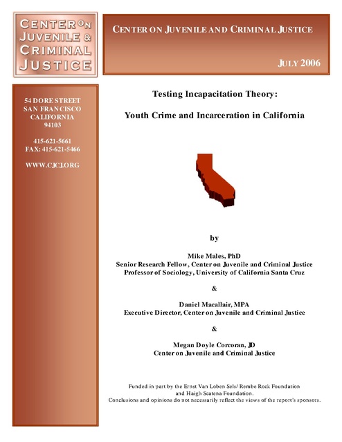 Incapacitation Is N ot the Answ er CEN TER ON JUVEN ILE AN D CRIMIN AL JUSTICE JULY 2006 54 D ORE STREET SAN FRAN CISCO CALIFORN IA 94103 Testing Incapacitation Theory: Youth Crime and Incarceration in California 415-621-5661 FAX: 415-621-5466 WWW.CJCJ.ORG by Mike Males, PhD Senior Research Fellow , Center on Juvenile and Criminal Justice Professor of Sociology, University of California Santa Cruz & D aniel Macallair, MPA Executive D irector, Center on Juvenile and Criminal Justice & Megan D oyle Corcoran, JD Center on Juvenile and Criminal Justice Fu nd ed in p art by the Ernst Van Loben Sels/ Rem be Rock Fou nd ation and H aigh Scatena Fou nd ation. Conclu sions and op inions d o not necessarily reflect the view s of the rep ort’s sp onsors. Testing Incapacitation Theory Testing Incapacitation Theory: Youth Crime and Incarceration in California Between 1980 and 2004, the rate of juvenile incarceration in California fell by nearly 50 percent. Despite the presence of fewer youth behind bars, the juvenile felony rates dropped in the same period by 58 percent between 1980 and 2004. California’s per-capita adult imprisonment rate has increased five-fold since 1980, from 137 per 100,000 residents to 689 per 100,000 residents in 2006. From 1980 through 2004, despite a 500 percent increase in adult imprisonment rates, the adult felony rate actually increased by 11 percent. California’s current juvenile crime rates, including youth arrested for homicide, violent crime, and property crime, are among the lowest recorded since 1960. In 2004, a California teenager was less likely to be arrested for a felony (including murder, other violent, and property offenses) than a teenager in the 1960s. On a per capita basis, the 1959 population of incarcerated youth was nearly three times greater than the same population in 2006. As of 2006, the commitment rate to California youth correctional institutions was 65 per 100,000. This represents the lowest recorded commitment rate in California history. From 2002 through 2004, Monterey County posted the highest Division of Juvenile Justice commitment rates, sending its youth to the DJJ at seven times the rate of Orange County, which posted the lowest committing rates. The simultaneous drop in youth crime and youth incarceration in California discredits incapacitation theory and suggests that the crime reduction must be rooted in other societal circumstances. Youths from primarily rural counties are subject to greater risk of incarceration for less severe offenses than peers from more urban environments. The Center on Juvenile and Criminal Justice (CJCJ) was established to promote balanced criminal justice policies. CJCJ' s mission is pursued through the development of model programs, technical assistance, research/policy analysis, and public education. CJCJ' s policy efforts are currently centered on sentencing and reentry policy and juvenile justice reform. By working in partnership with major criminal justice stakeholders including legislators, correctional administrators, district attorney offices, defender advocates, community-based organizations, and civil rights groups, CJCJ plays an important role in building a broad consensus on policy options. This research is funded in part by generous grants from the Haigh-Scatena Foundation and the van Löben Sels/Rembe Rock Foundation. The authors would like to express a special thank you to Randy Sheldon, Dinky Manek Enty and Stephanie Ong for graciously contributing to the completion of this report. Page 1 Testing Incapacitation Theory Abstract With serious problems plaguing California’s juvenile justice system, the efficacy of incapacitating juveniles in the Division of Juvenile Justice (DJJ) correctional facilities must be reexamined. California’s youth incarceration patterns offer an opportunity to analyze the validity of incapacitation theory as it applies to young people. Under incapacitation theory, counties with higher youth incarceration rates are expected to experience accelerated reductions in juvenile crime. Failure to demonstrate reduced crime rates through higher levels of juvenile incarceration calls incapacitation theory into serious question as an effective youth crime reduction strategy. This study will examine California’s juvenile incarceration and crime trends over the past 47 years. In addition to statewide trends, county-by-county youth incarceration practices and crime patterns are examined to determine differential outcomes between high incarceration and low incarceration counties. Introduction For much of the past three decades, policies emphasizing incapacitation have dominated California criminal and juvenile justice policy. In 1977, the passage of the determinate sentencing act eliminated rehabilitation as a sentencing 1 goal in the adult context. The State government adopted determinate sentencing with the approbation of both political parties who found the previous system either unfair or unreliable and lenient. With determinate sentencing, the public could be assured that offenders would be placed behind bars for a definite period of time, regardless of any treatment or education undertaken during incarceration. Rehabilitation, thus, became an issue of little import in the adult context. The stated purpose of the California juvenile justice system has long been the protection of the public through the 2 rehabilitation and correction of young offenders. Despite this intention, the prevailing policy trend initiated by the 1977 act resulted in increased incarceration among juveniles and transfers to adult court. The increased reliance on institutionalization after 1977, coupled with the abominable conditions and lack of treatment opportunities in the DJJ 3 institutions, has created a system that seems more interested in retribution than rehabilitation. Juveniles are now more likely to be subjected to the punitive goals as expressed in the adult context, rather than afforded 