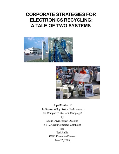 CORPORATE STRATEGIES FOR ELECTRONICS RECYCLING: A TALE OF TWO SYSTEMS A publication of the Silicon Valley Toxics Coalition and the Computer TakeBack Campaign! by Sheila Davis Project Director, SVTC Clean Computer Campaign and Ted Smith, SVTC Executive Director June 25, 2003 CONTENTS I. EXECUTIVE SUMMARY 3 II. INTRODUCTION A. Background B. Report Structure 5 6 III OVERVIEW A. Health Impacts of Hazardous Waste B. Hazardous Materials in E-Waste and their Effects on Humans and the Environment C. Methodology 1. Overview of Electronic Disassembly, Recycling, and Processing and Workers Health and Safety Protections 1.A. Disassembly Process 1.B. Development of Efficient Materials Processing Systems 1.C. Worker and Environmental Protections 11 IV. SVTC TOUR OF RECYCLING FACILITIES A. Visit to HP - Micro Metallics 1. HP - Micro Metallics Recycling Warehousing System 2. HP - Micro Metallics Disassembly Process 3. HP - Micro Metallics Materials Processing System 4. HP - Micro Metallics Worker Protections 4.A. Health and Safety Program 4.B. Worker-initiated Protections 13 13 13 13 13 14 14 14 B. Visit to United States Penitentiary Atwater UNICOR Recycling Facility 1. UNICOR Warehousing System 2. UNICOR Disassembly System 3. UNICOR Materials Processing System 4. UNICOR Worker Protections 4.A. Health and Safety Program 4.B. Worker-initiated Protections 14 15 15 15 16 16 17 V. CONCLUSION 17 VI. ENDNOTES 19 8 9 9 10 10 11 Appendix A: Letter to Barbara Materna, Acting Chief, Occupational Health Branch, CA Dept. of Health Services Appendix B: Letter from Barbar Materna to Steve Skurna, President of Micro Metallics Appendix C: Report: Occupational Health Branch Walk Through of Micro Metallics I. EXECUTIVE SUMMARY The problem of electronic waste (e-waste) is growing at an unsustainable rate. E-waste is now the fastest growing, and most toxic, component of municipal garbage. Local governments are facing huge costs to handle e-waste, and even greater costs if they do not capture this toxic stream and handle it in an appropriate manner. Recycling is both a means of preventing the land disposal of toxic metals in e-waste and recovering some value. The Computer TakeBack Campaign, an advocacy coalition, is developing and campaigning for appropriate models for managing e-waste. (For more information about the campaign, its goals and work see http://www.computertakeback.com). This case study compares two very different models for recycling obsolete computers and electronics hardware that have been created by the two largest computer makers in the U.S. — Hewlett Packard’s partnership with Micro Metallics of Roseville, California, and Dell Computers’ (recently renamed Dell, Inc.) partnership with UNICOR, the Federal Prison Industry. Our methodology included visits to both sites to examine the facilities for a number of characteristics: • Transparency and accountability to the public Handling large amounts of e-waste poses risks of toxic contamination to workers and surrounding communities if conducted carelessly. Thus, the most basic criterion that employees and citizens should rightfully expect from any recycling operation is that it be open to public inspection. • General compliance with occupational health and safety standards Observance of health and safety standards in the workplace is important for protecting workers from exposure to toxics. It is also a powerful indicator of broader compliance with environmental requirements. Well-trained workers, who are fully protected by the law to seek advice and take action to protect their health and the environment without fear of reprisal from their employer, are the most effective environmental protection. Operations that expose workers to hazards also frequently fail to protect communities around their facilities from dangerous emissions. Seldom does an industrial facility with a well-managed occupational health and safety program, and workers who are fully empowered to initiate corrective actions, violate environmental standards. • Use of best recycling practices and their potential for wide adoption by the private sector Electronic waste is a fairly new category of resource recovery. As the nation responds to this growing challenge to waste management systems and the environment, we must quickly develop the infrastructure required to handle huge volumes of e-waste. How do we build this new segment of our economy so that it is thriving, sustainable and independent of the public treasury? This study found that the two facilities differed dramatically in their transparency to the public. The Atwater facility exhibited a “fortress UNICOR” mentality, allowing only restricted access to investigators. UNICOR failed to respond to repeated requests to allow an industrial hygienist trained in occupational health and safety to inspect its facility, approving the visit too late for its findings to be included here. During a visit by other inspectors for this study, both investigators and inmates were forbidden from speaking with each other. Fortunately, the investigators were able to supplement their observations with testimonials from inmates, which are presented anonymously in this report to protect prisoners from reprisal. The Atwater facility refused to provide air quality test results, claiming that this information would have to be sought through a Freedom of Information Act request addressed to the federal Bureau of Prisons. “Even when I wear the paper mask, I blow out black mu- In contrast, the Micro Metallics - Hewlett-Packard facility allowed our industrial cus from my hygienist to inspect freely, permitted investigators to speak informally with employnose everyday.” ees, and provided air monitoring and employee blood –lead test results. ---an inmate at Atwater The strikingly dissimilar picture at the two operations offers a contrast between some of the worst and best recycling practices. Safety and health standards were very different at the two