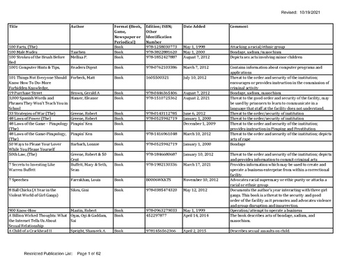 Revised: 10/19/2021 Title Author Edition; ISBN; Other Identification Number 978-1258030773 978-3822881620 978-1852427887 Date Added Comment Taschen Mellisa P. Format (Book, Game, Newspaper or Periodical) Book Book Book May 1, 1998 May 1, 2000 August 7, 2012 Attacking a racial/ethnic group Bondage, sadism/masochism Depicts sex acts involving minor children Readers Digest Book 978-0762103386 March 7, 2012 Forbeck, Matt Book 1605500321 July 10, 2012 Brown, Gerald A Hamer, Eleanor Book Book 978-0446365406 978-1510725362 August 7, 2012 August 2, 2021 Greene, Robert Greene, Robert Pimpin' Ken Book Book Book 978-0143112785 978-0525942719 June 6, 2012 January 1, 2000 December 1, 2009 Pimpin' Ken Book 978-1416961048 March 10, 2012 Barbach, Lonnie Book 978-0525942719 January 1, 2000 Contains information about computer programs and applications Threat to the order and security of the institution; encourages or provides instruction in the commission of criminal activity Bondage, sadism, masochism Threat to the good order and security of the facility, may be used by prisoners to learn to communicate in a language that staff at the facility does not understand. Threat to the order/security of institution Threat to the order/security of institution Threat to the order and security of the institution; provides instruction in Pimping and Prostitution Threat to the order and security of the institution; depicts acts of rape Bondage Book 978-1846680687 January 10, 2012 7 Secrets to Investing Like Warren Buffett Greene, Robert & 50 Cent Buffett, Mary & Seth, Sean Book 978-1982130336 March 17, 2021 7 Speeches Farrakhan, Louis Book B0006WKKTS November 10, 2012 8 Ball Chicks (A Year in the Violent World of Girl Gangs) Sikes, Gini Book 978-0385474320 May 12, 2012 900 Know-How A Billion Wicked Thoughts: What the Internet Tells Us About Sexual Relationship A Child of a Crackhead II Mastin, Robert Ogas, Ogi & Gaddam, Sai Book Book 978-0963279033 452297877 May 1, 1999 April 14, 2014 Speight, Shameek A. Book 9781456562366 April 2, 2015 100 Facts, (The) 100 Male Nudes 100 Strokes of the Brush Before Bed 1001 Computer Hints & Tips, 101 Things Not Everyone Should Know How To Do- More Forbidden Knowledge, 19 Purchase Street 3,000 Spanish Words and Phrases They Won't Teach You in School 33 Strategies of War (The) 48 Laws of Power (The) 48 Laws of the Game – Pimpology (The) 48 Laws of the Game-Pimpology, (The) 50 Ways to Please Your Lover While You Please Yourself 50th Law, (The) Restricted Publication List: Page 1 of 62 Threat to the order and security of the institution; depicts and provides information to commit criminal acts Provides information which may be used to create and operate a business enterprise from within a correctional facility. Advocates racial supremacy or ethic purity or attacks a racial or ethnic group Documents the author’s year interacting with three girl gangs. This book is a threat to the security and good order of the facility as it promotes and advocates violence and group disruption and insurrection. Operation/attempt to operate a business The book describes acts of bondage, sadism, and masochism. Describes sexual assaults on child. Revised: 10/19/2021 A Girl From Flint Hernandez, Treasure Book 1601624735 October 14, 2014 A King and a Nine A Lovely Murder Down South Hutson, Darrin Johnson, Paul book Book 9787494309796 April 2, 2015 November 1, 2006 A Piece of Cake Brown, Cupcake Book 1400052297 January 14, 2014 A Pimp’s Life Hernandez, Treasure Book A Pound of Flesh Wright, Susan Book A Prisoner's Experience March 1, 2010 045-146-1274 January 13, 2013 Prisoners Incarcerated Book 978-1495998331 May 1, 2015 A Rose's Thorn Turner, Brittany Book 9781070424439 August 24, 2019 A Study Guide, The Uniform Commercial Code and other things Related…For Freedom in America Today! A Time to Kill A Natural Person Book Grisham, John Book 978-0440245919 January 6, 2015 A+ Certification Exam Guide Myers, Michael Abolitionist (The) - Summer 2018 Book Article 978-0071795128 August 6, 2012 August 28, 2018 Abolitionist (The), Summer 2016 Article November 4, 2016 Advanced Dungeons & Dragons Game August 1, 1999 Advanced Dungeons & Dragons Axe of the Dwarvish Lords Advanced Dungeons & Dragons Complete Book of Humanoids Advanced Dungeons & Dragons Drow of the Underdard Game November 1, 2000 Greenwood, Ed Restricted Publication List: Page 2 of 62 August 1, 2009 Game No. 2135 August 1, 1999 Game No. 9326 August 1, 1999 Includes content which depicts the sexual assault of a child. Includes contents which describes sadistic acts. Threat to the order/security of the institution; Depicts sexual acts involving children Describes and depicts the sexual assault and rape of a child. Threat to the order and security of the institution; depicts acts of rape This book contains passages which describe and/or depict acts of bondage. Treat to the order and security of the institution; contains detailed identification and photographs of prisoners currently incarcerated in MDOC facilities including information about their criminal convictions. This book includes personal information about an MDOC employee. Threat to the order and security of the institution; mail advocating or promoting violation of state or deferral law. Includes contents which describes the sexual assault of a child. May facilitate or encourage criminal activity Advocates and promotes group disruption and insurrection. The publication includes language which calls for prisoner to stage a coordinated protest including work stoppage, sit-ins, spending boycotts and hunger stickers. Advocates and promotes group disruption and insurrection. The publication includes language which calls for prisoner to stage a coordinated protest and work stoppage. Threat to the order and security of the institution; role play Threat to the order and security of the institution; role play Threat to the order and security of the institution; role play Threat to the order and security