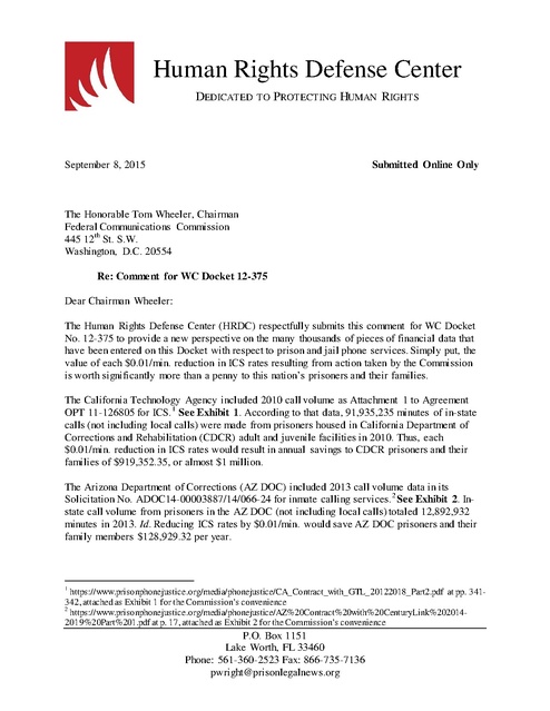 Human Rights Defense Center DEDICATED TO PROTECTING HUMAN RIGHTS September 8, 2015 Submitted Online Only The Honorable Tom Wheeler, Chairman Federal Communications Commission 445 12th St. S.W. Washington, D.C. 20554 Re: Comment for WC Docket 12-375 Dear Chairman Wheeler: The Human Rights Defense Center (HRDC) respectfully submits this comment for WC Docket No. 12-375 to provide a new perspective on the many thousands of pieces of financial data that have been entered on this Docket with respect to prison and jail phone services. Simply put, the value of each $0.01/min. reduction in ICS rates resulting from action taken by the Commission is worth significantly more than a penny to this nation’s prisoners and their families. The California Technology Agency included 2010 call volume as Attachment 1 to Agreement OPT 11-126805 for ICS. 1 See Exhibit 1. According to that data, 91,935,235 minutes of in-state calls (not including local calls) were made from prisoners housed in California Department of Corrections and Rehabilitation (CDCR) adult and juvenile facilities in 2010. Thus, each $0.01/min. reduction in ICS rates would result in annual savings to CDCR prisoners and their families of $919,352.35, or almost $1 million. The Arizona Department of Corrections (AZ DOC) included 2013 call volume data in its Solicitation No. ADOC14-00003887/14/066-24 for inmate calling services. 2 See Exhibit 2. Instate call volume from prisoners in the AZ DOC (not including local calls) totaled 12,892,932 minutes in 2013. Id. Reducing ICS rates by $0.01/min. would save AZ DOC prisoners and their family members $128,929.32 per year. 1 https://www.prisonphonejustice.org/media/phonejustice/CA_Contract_with_GTL_20122018_Part2.pdf at pp. 341342, attached as Exhibit 1 for the Commission’s convenience 2 https://www.prisonphonejustice.org/media/phonejustice/AZ%20Contract%20with%20CenturyLink%2020142019%20Part%201.pdf at p. 17, attached as Exhibit 2 for the Commission’s convenience P.O. Box 1151 Lake Worth, FL 33460 Phone: 561-360-2523 Fax: 866-735-7136 pwright@prisonlegalnews.org Page |2 Census data updated in 2011 indicates that both California and Arizona experienced “significant increases in the number of children living in poverty and the number of people living in deep poverty. The Census defines people in deep poverty when they make 50% below the poverty line, which is $23,050 for a family of four.” 3 Numerous filings on this Docket demonstrate that a disproportionate number of prisoners and their families are poor. 4 The annual savings that would result from each $0.01/minute reduction in ICS rates for prisoners’ families in California and Arizona would be significant and, in some cases, would eliminate the need for hard choices to be made between staying in touch with loved ones during critical times of incarceration and buying food or paying rent and utilities. Each $0.01/min. ICS rate reduction is just as significant to families in states with small prisoner populations as it is to families with loved ones in the CDCR or AZ DOC. Prisoners in the South Dakota DOC, which has a population of just 3,651, 5 placed in-state calls (excluding local calls) totaling 3,962,119 minutes from April 2014 through March 2015. 6 See Exhibit 3. A reduction in ICS rates of just one penny per minute is thus worth $39,621.19 annually to South Dakota prisoners and their family members. HRDC remains steadfast in our position that ICS rates should be capped at $.05/min. for all types of calls, and we note at least eight state DOCs already charge ICS rates at or below that level. 7 ICS rates at CDCR prisons are $0.135/min. for all intrastate calls, and a reduction in ICS rates at CDCR facilities to $0.05/min. (a reduction of $0.085 per minute) would result in annual savings to California prisoners and their families of $7,814,495. The AZ DOC charges a $2.00 connection fee + $.24/min. for prepaid/debit intrastate interLATA calls, and a $2.40 connection fee + $.24/min. for collect interLATA calls. Prepaid/debit intrastate intraLATA calls require a $1.60 connection fee + $0.24/min., and there is a $2.00 connection fee for collect intraLATA calls + $0.20/min. 8 A rate reduction of $0.19/min. would bring current intrastate interLATA per-minute rates down to $0.05/min. and save Arizona prisoners and their families $2,449,657 annually, while reducing the intrastate intraLATA rates by $0.15/min. to $0.05/min. would result in savings of $1,933,939.80. Although the combined annual savings of $4,383,596.80 for intrastate calls to Arizona families would be huge, the elimination of the connection fee required for each phone call is equally important. The AZ DOC tallied 974,799 intrastate calls during 2013 (not including local calls) (Exhibit 2). The total cost for connection fees alone was just under $2 million ($1,999,281.60), paid by prisoners and their families, many of them poor, for the “privilege” of then paying an additional intrastate rate of $0.20-.24/min. For this reason, in addition to our position that ICS rates should be capped at $0.05/min. for all types of calls, we renew our call for the Commission to abolish not only ICS connection fees but all ancillary fees related to ICS, which serve as nothing more than another unjustified way to price gouge prisoners and their families. Unless the issue of fees is addressed, any rate caps 3 www.usatoday.com/story/news/nation/2014/10/06/state-poverty-rates-unemployed/1585837; the 2015 federal poverty level for a family of four is $24,250. See http://familiesusa.org/product/federal-poverty-guidelines 4 Also see, e.g., “Prisons of Poverty: Uncovering the pre-incarceration incomes of the imprisoned,” Prison Policy Initiative (July 9, 2015); www.prisonpolicy.org/reports/income.html 5 www.bjs.gov/content/pub/pdf/p13.pdf (Table 2) 6 Pay Tel Communications, Inc. Notice of Ex Parte (Attachment 1), Docket WC 12-375 filed August 24, 2015, relevant page attached as Exhibit 3 for the 