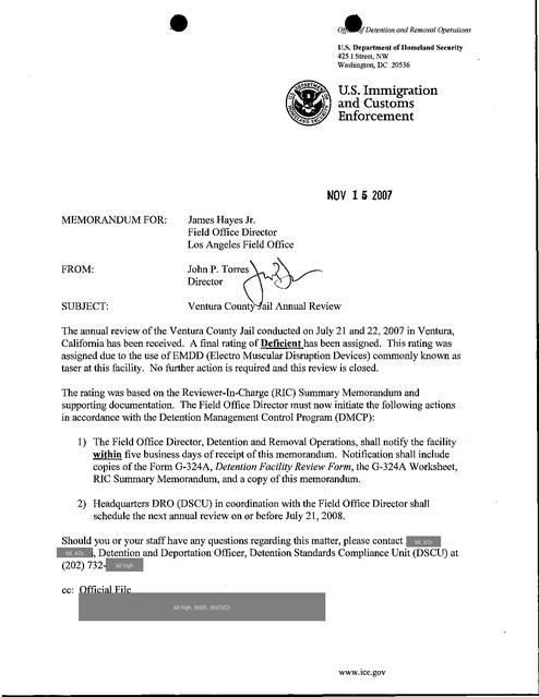 ICE Detention Standards Compliance Audit - Ventura County Jail, Ventura, CA, ICE, 2007