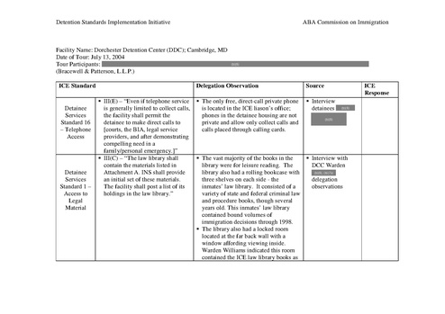 Detention Standards Implementation Initiative ABA Commission on Immigration Facility Name: Dorchester Detention Center (DDC); Cambridge, MD Date of Tour: July 13, 2004 Tour Participants: (Bracewell & Patterson, L.L.P.) ICE Standard Detainee Services Standard 16 – Telephone Access Detainee Services Standard 1 – Access to Legal Material III(E) – “Even if telephone service is generally limited to collect calls, the facility shall permit the detainee to make direct calls to [courts, the BIA, legal service providers, and after demonstrating compelling need in a family/personal emergency.]” III(C) – “The law library shall contain the materials listed in Attachment A. INS shall provide an initial set of these materials. The facility shall post a list of its holdings in the law library.” (b)(6) Delegation Observation Source ICE Response The only free, direct-call private phone is located in the ICE liason’s office; phones in the detainee housing are not private and allow only collect calls and calls placed through calling cards. Interview detainees (b)(6) (b)(6) The vast majority of the books in the Interview with library were for leisure reading. The DCC Warden (b)(6), (b)(7)c library also had a rolling bookcase with three shelves on each side - the delegation inmates’ law library. It consisted of a observations variety of state and federal criminal law and procedure books, though several years old. This inmates’ law library contained bound volumes of immigration decisions through 1998. The library also had a locked room located at the far back wall with a window affording viewing inside. Warden Williams indicated this room contained the ICE law library books as Detention Standards Implementation Initiative Detainee Services Standard 9 – Group Presentations of Legal Rights Detainee Services Standard 13 – Recreation Detainee ABA Commission on Immigration well as a variety of other materials used by the facility (e.g., GED books). ICE and DDC staff stated that the DDC meets its library requirement for immigration materials through providing a Lexis database on CDROM (in an unopened sleeve). I – “Facilities holding INS DDC does not allow groups to make detainees shall permit authorized presentations to detainees, because this persons to make presentations to would disrupt operations of the facility groups of detainees for the purpose and also amount to solicitation of of informing them of U.S. business by these groups. immigration law and procedures, consistent with the security and orderly operation of each facility.” III(B) – “If outdoor recreation is Weather permitting, detainees are available at the facility, each allowed one hour of outdoor recreation detainee shall have access for at twice per week. least one hour daily, at a Attorney visitation time, and possibly reasonable time of day, five days a library time, can conflict with the week, weather permitting. If only gymnasium portion of detainees’ indoor recreation is available, indoor recreation time. detainees shall have access for at Detainees receiving pain medication least one hour each day and shall are denied recreation time. have access to natural light. Under no circumstances will the facility require detainees to forgo basic law library privileges for recreation privileges.” III(H) – “[Segregated] detainees DDC policy appears to take the shall be offered at least one hour position that recreation (in particular, Interview with (b)(6), (b)(7)c Interview with DDC Warden (b)(6), (b)(7)c Interview with DDC Warden (b)(6), (b)(7)c ; Interview with ICE Supervisor (b)(6), (b)(7)c ; detaineedelegation interviews Interview with DDC Warden Detention Standards Implementation Initiative Services Standard 13 – Recreation Detainee Services Standard 18 – Voluntary Work Program of recreation per day, scheduled at a reasonable time, at least five days per week. This privilege shall be waived only if the detainee’s recreation[n] would unreasonably endanger safety/security.” I – “Every facility with a work program will provide detainees the opportunity to work and earn money.” ABA Commission on Immigration (b)(6), (b)(7)c physical recreation either outdoors or in the gymnasium) is a privilege. As such, detainees domiciled in locations other than the detainee pods (e.g., special management units, the DDC medical wing, etc.) forego recreation. The DDC does maintain a voluntary, Delegation compensated work program. However, observation; Warden Williams initially stated that, Interview with in his understanding, the ICE does not DDC Warden (b)(6), (b)(7)c allow detainees to work for pay at all. Nonetheless, Warden Williams has made exceptions to what he understood was ICE policy by permitting certain detainees who he believes are indigent and truly in need of money to work. MEMORANDUM To: Victor Cerda, Acting Director, Office of Detention and Removal, Immigration and Customs Enforcement From: American Bar Association Delegation to Dorchester Detention Center1 Re: Compliance with ICE Detention Standards at the Dorchester Detention Center facility Date: September 13, 2004 This memorandum summarizes and evaluates information gathered at the Dorchester Detention Center in Cambridge, Maryland (“DDC”), through discussions with DDC and local Immigration and Customs Enforcement (“ICE”) personnel, interviews with ICE detainees (“detainees”), and observations by delegation members during the delegation’s July 13, 2004, visit. I. INS/ICE DETENTION STANDARDS The Immigration and Naturalization Service promulgated the “INS Detention Standards” (“Standards”) in November 2000 to ensure the “safe, secure and humane treatment of individuals detained by the INS.” The Standards contained in the Detention Operations Manual cover a broad range of issues falling within the categories of detainee services (such as access to legal materials and recreational opportunities), security and control (