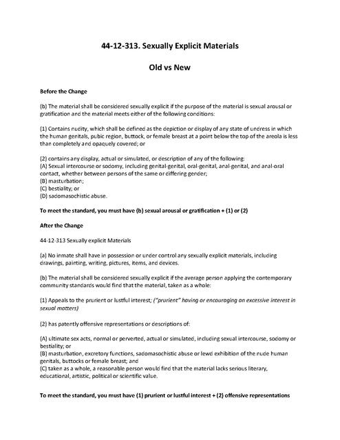 44-12-313. Sexually Explicit Materials Old vs New Before the Change (b) The material shall be considered sexually explicit if the purpose of the material is sexual arousal or gratification and the material meets either of the following conditions: (1) Contains nudity, which shall be defined as the depiction or display of any state of undress in which the human genitals, pubic region, buttock, or female breast at a point below the top of the areola is less than completely and opaquely covered; or (2) contains any display, actual or simulated, or description of any of the following: (A) Sexual intercourse or sodomy, including genital-genital, oral-genital, anal-genital, and anal-oral contact, whether between persons of the same or differing gender; (B) masturbation; (C) bestiality; or (D) sadomasochistic abuse. To meet the standard, you must have (b) sexual arousal or gratification + (1) or (2) After the Change 44-12-313 Sexually explicit Materials (a) No inmate shall have in possession or under control any sexually explicit materials, including drawings, painting, writing, pictures, items, and devices. (b) The material shall be considered sexually explicit if the average person applying the contemporary community standards would find that the material, taken as a whole: (1) Appeals to the prurient or lustful interest; (“prurient” having or encouraging an excessive interest in sexual matters) (2) has patently offensive representations or descriptions of: (A) ultimate sex acts, normal or perverted, actual or simulated, including sexual intercourse, sodomy or bestiality; or (B) masturbation, excretory functions, sadomasochistic abuse or lewd exhibition of the nude human genitals, buttocks or female breast; and (C) taken as a whole, a reasonable person would find that the material lacks serious literary, educational, artistic, political or scientific value. To meet the standard, you must have (1) prurient or lustful interest + (2) offensive representations (2) Must have meet (A) and or (B) + (C)