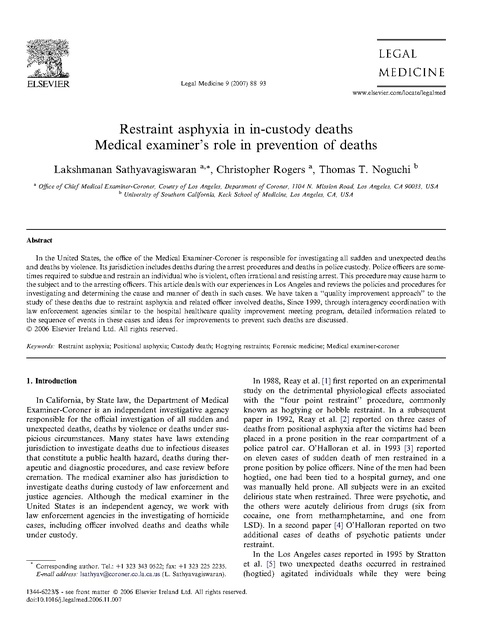 Legal Medicine 9 (2007) 88–93 www.elsevier.com/locate/legalmed Restraint asphyxia in in-custody deaths Medical examiner’s role in prevention of deaths Lakshmanan Sathyavagiswaran a a,* , Christopher Rogers a, Thomas T. Noguchi b Office of Chief Medical Examiner-Coroner, County of Los Angeles, Department of Coroner, 1104 N. Mission Road, Los Angeles, CA 90033, USA b University of Southern California, Keck School of Medicine, Los Angeles, CA, USA Abstract In the United States, the office of the Medical Examiner-Coroner is responsible for investigating all sudden and unexpected deaths and deaths by violence. Its jurisdiction includes deaths during the arrest procedures and deaths in police custody. Police officers are sometimes required to subdue and restrain an individual who is violent, often irrational and resisting arrest. This procedure may cause harm to the subject and to the arresting officers. This article deals with our experiences in Los Angeles and reviews the policies and procedures for investigating and determining the cause and manner of death in such cases. We have taken a ‘‘quality improvement approach’’ to the study of these deaths due to restraint asphyxia and related officer involved deaths, Since 1999, through interagency coordination with law enforcement agencies similar to the hospital healthcare quality improvement meeting program, detailed information related to the sequence of events in these cases and ideas for improvements to prevent such deaths are discussed. Ó 2006 Elsevier Ireland Ltd. All rights reserved. Keywords: Restraint asphyxia; Positional asphyxia; Custody death; Hogtying restraints; Forensic medicine; Medical examiner-coroner 1. Introduction In California, by State law, the Department of Medical Examiner-Coroner is an independent investigative agency responsible for the official investigation of all sudden and unexpected deaths, deaths by violence or deaths under suspicious circumstances. Many states have laws extending jurisdiction to investigate deaths due to infectious diseases that constitute a public health hazard, deaths during therapeutic and diagnostic procedures, and case review before cremation. The medical examiner also has jurisdiction to investigate deaths during custody of law enforcement and justice agencies. Although the medical examiner in the United States is an independent agency, we work with law enforcement agencies in the investigating of homicide cases, including officer involved deaths and deaths while under custody. * Corresponding author. Tel.: +1 323 343 0522; fax: +1 323 225 2235. E-mail address: lsathyav@coroner.co.la.ca.us (L. Sathyavagiswaran). In 1988, Reay et al. [1] first reported on an experimental study on the detrimental physiological effects associated with the ‘‘four point restraint’’ procedure, commonly known as hogtying or hobble restraint. In a subsequent paper in 1992, Reay et al. [2] reported on three cases of deaths from positional asphyxia after the victims had been placed in a prone position in the rear compartment of a police patrol car. O’Halloran et al. in 1993 [3] reported on eleven cases of sudden death of men restrained in a prone position by police officers. Nine of the men had been hogtied, one had been tied to a hospital gurney, and one was manually held prone. All subjects were in an excited delirious state when restrained. Three were psychotic, and the others were acutely delirious from drugs (six from cocaine, one from methamphetamine, and one from LSD). In a second paper [4] O’Halloran reported on two additional cases of deaths of psychotic patients under restraint. In the Los Angeles cases reported in 1995 by Stratton et al. [5] two unexpected deaths occurred in restrained (hogtied) agitated individuals while they were being 1344-6223/$ - see front matter Ó 2006 Elsevier Ireland Ltd. All rights reserved. doi:10.1016/j.legalmed.2006.11.007 L. Sathyavagiswaran et al. / Legal Medicine 9 (2007) 88–93 transported by advanced life support ambulances. Law enforcement personnel had placed both patients in hobble restraints. Toxicological analysis revealed non-lethal levels of amphetamines in one patient and non-lethal levels of ethanol, cocaine, and amphetamines in the other. Stratton et al. in 2001 [6] reported on 18 other cases of such deaths witnessed by emergency medical service (EMS) personnel. In all 18 cases, the individuals had been restrained with the wrists and ankles bound and tied together behind the back. Associated with all these sudden death cases was struggle by the victims against the forced restraint, followed by cessation of struggling with labored or agonal breathing immediately before cardiopulmonary arrest. Also associated were stimulant drug use, chronic disease, and obesity. The report noted that unexpected sudden death when excited delirium victims are restrained in the out-of-hospital setting is not infrequent and can be associated with multiple predictable, but usually uncontrollable, factors. 89 rendering a cause and manner of death, and to communicate with the police department to elucidate the cause and mechanism of death, and provide the key information for prevention of similar deaths in the future. 2.2. The standard autopsy procedures 2.1. Investigative aspect A well-qualified forensic pathologist is assigned to conduct such autopsies. The external examination should be meticulous. The pathologist should note and record even faint subtle bruises and abrasions. They may later become important, correlating circumstantial investigative findings with injuries, particularly the time of injuries. The direction of force of abrasion may become a crucial issue. Equal importance should be placed on any absence of injury on the head, neck, upper extremities as well as the lower extremities and the genitals. If there is any evidence of physical contact to the decedent, it is presumed that the contact may be the lethal act and all caution should be take