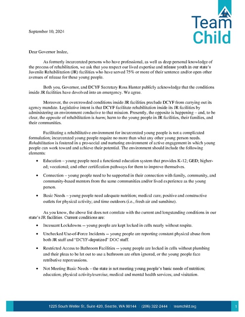 September 10, 2024 Dear Governor Inslee, As formerly incarcerated persons who have professional, as well as deep personal knowledge of the process of rehabilitation, we ask that you respect our lived expertise and release youth in our state’s Juvenile Rehabilitation (JR) facilities who have served 75% or more of their sentence and/or open other avenues of release for these young people. Both you, Governor, and DCYF Secretary Ross Hunter publicly acknowledge that the conditions inside JR facilities have devolved into an emergency. We agree. Moreover, the overcrowded conditions inside JR facilities preclude DCYF from carrying out its agency mandate. Legislative intent is that DCYF facilitate rehabilitation inside its JR facilities by administering an environment conducive to that mission. Presently, the opposite is happening – and, to be clear, the opposite of rehabilitation is harm; harm to the young people in JR facilities, their families, and their communities. Facilitating a rehabilitative environment for incarcerated young people is not a complicated formulation; incarcerated young people require no more than what any other young person needs. Rehabilitation is fostered in a pro-social and nurturing environment of active engagement in which young people can work toward and achieve their potential. The environment should include the following elements: • Education – young people need a functional education system that provides K-12; GED; highered; vocational; and other certification pathways for them to improve themselves. • Connection – young people need to be supported in their connection with family, community, and community-based mentors from the same communities and/or lived experience as the young person. • Basic Needs – young people need adequate nutrition; medical care; positive and constructive outlets for physical activity; and time outdoors (i.e., fresh air and sunshine). As you know, the above list does not correlate with the current and longstanding conditions in our state’s JR facilities. Current conditions are: • Incessant Lockdowns -- young people are kept locked in cells nearly without respite. • Unchecked Use-of-Force Incidents -- young people are reporting constant physical abuse from both JR staff and “DCYF-deputized” DOC staff. • Restricted Access to Bathroom Facilities -- young people are locked in cells without plumbing and their pleas to be let out to use a bathroom are often ignored, or the young people face retributive repercussions. • Not Meeting Basic Needs – the state is not meeting young people’s basic needs of nutrition; education; physical activity/exercise; medical and mental health services; and visitation. 1225 South Weller St, Suite 420, Seattle, WA 98144 I (206) 322-2444 I teamchild.org 1 RCW 9.94A.870 empowers you to “[c]all the sentencing guidelines commission into an emergency meeting for the purpose of evaluating the standard ranges and other standards. The commission may adopt any revision or amendment to the standard ranges or other standards that it believes appropriate to deal with the emergency situation.” Governor Inslee, we call upon you to act to address the harm taking place, and to begin to move in a direction in which rehabilitation is possible in our state’s JR facilities. We ask that you release youth who have served 75% or more of their sentence and/or open other avenues of release for these young people. Respectfully, Arthur Longworth Policy Manager, TeamChild arthur.longworth@teamchild.org (206) 322-2479 • • • • • • • • • • • • Anthony Powers, anthony@americanequityconsulting.com American Equity & Justice Group, Executive Director, Board President [Please note, I support JR Executive staff in their efforts; they are doing the best they can. However, staff are constrained by an overburdened institution attempting to operate beyond its capacity.] Devon Adams, devon@collectivejusticenw.org Collective Justice, Community Engagement Director Percy Levy, percylevy1@gmail.com WA Defenders Association, Outreach Specialist Black Lives Matter, Board of Directors/Treasurer Redemption Auto Sales, Owner Faraji Blakeney, farajibhakti@yogabehindbars.org Yoga Behind Bars, Co-Executive Director Kimonti Carter, kimonti@blackprisonerscaucuscg.org The Black Prisoners Caucus Community Group, President TEACH Education Committee, Director Office of Public Defense, Community Outreach Specialist Participatory Justice, Mobilization & Community Engagement Paul Wright, pwright@prisonlegalnews.org Human Rights Defense Center, Director Prison Legal News, Editor Derek Gronquist, dgronquist@humanrightsdefensecenter.org Human Rights Defense Center, Paralegal Gail Brashear, gail@seattleclemencyproject.org Seattle Clemency Project, Paralegal Eddie Purpose, eddie@progresspushers.org Progress Pushers, Executive Director Jacob Ivan Schmitt, jacob@justussolutions Just Us Solutions, Executive Director Rory Andes, rory@justussolutions Just Us Solutions, Assistant Director Willie Nobles, willie_1020@yahoo.com Black Prisoners Caucus Community Group, Vice President The Change Program 1225 South Weller St, Suite 420, Seattle, WA 98144 I (206) 322-2444 I teamchild.org 2 • • • • • • • • • • Cc L. Elizabeth Shatswell, elizabeth.shatswell@ithaka.org ITHAKA, Correctional Education Manager University of Puget Sound, Research Consultant Eugene Youngblood, eugeneyoungblood60@gmail.com Look2Justice, Director of Community Organizing Anthony Blankenship, anthony.blankenship@civilsurvival.org Civil Survival, Senior Community Organizer Kelly Olson, Kelly.olson@civilsurvival.org Civil Survival, Policy Manager Orlando Ames, orlando@communitypassageways.org Collective Justice, Community HEAL Facilitator Alex Mayo, alex@wavoices.org WA Voices, Executive Director Brandon Pedro, brandon@freedomprojectwa.org Freedom Project, Critical Incident Director James Chambers, jimchambers0423@gmail.com Weld Seattle, Recru