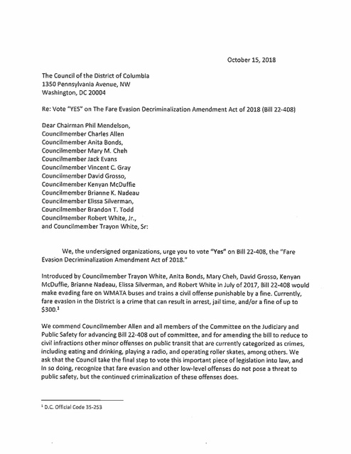 Letter in support of Fare Evasion Decriminalization Amendment Act in DC - Oct 2018