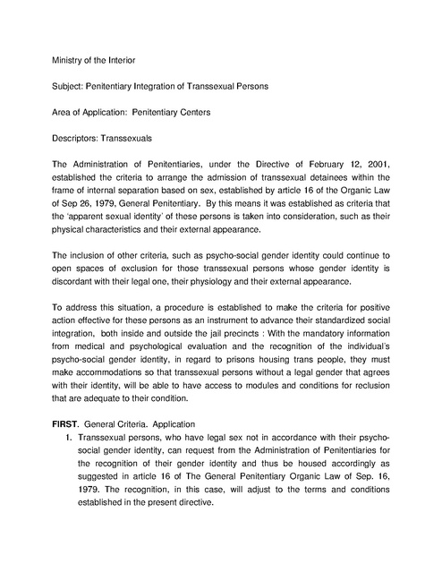 Ministry of the Interior Subject: Penitentiary Integration of Transsexual Persons Area of Application: Penitentiary Centers Descriptors: Transsexuals The Administration of Penitentiaries, under the Directive of February 12, 2001, established the criteria to arrange the admission of transsexual detainees within the frame of internal separation based on sex, established by article 16 of the Organic Law of Sep 26, 1979, General Penitentiary. By this means it was established as criteria that the ‘apparent sexual identity’ of these persons is taken into consideration, such as their physical characteristics and their external appearance. The inclusion of other criteria, such as psycho-social gender identity could continue to open spaces of exclusion for those transsexual persons whose gender identity is discordant with their legal one, their physiology and their external appearance. To address this situation, a procedure is established to make the criteria for positive action effective for these persons as an instrument to advance their standardized social integration, both inside and outside the jail precincts : With the mandatory information from medical and psychological evaluation and the recognition of the individual’s psycho-social gender identity, in regard to prisons housing trans people, they must make accommodations so that transsexual persons without a legal gender that agrees with their identity, will be able to have access to modules and conditions for reclusion that are adequate to their condition. FIRST. General Criteria. Application 1. Transsexual persons, who have legal sex not in accordance with their psychosocial gender identity, can request from the Administration of Penitentiaries for the recognition of their gender identity and thus be housed accordingly as suggested in article 16 of The General Penitentiary Organic Law of Sep. 16, 1979. The recognition, in this case, will adjust to the terms and conditions established in the present directive. 2. The recognition of the gender identity applied for does not imply a new legal gender identity either within or outside of the penitentiary enclosures. SECOND. Rights and Responsibilities. 1. In the application of gender identity, recognized as it pertains to penitentiaries these persons will have the right to: The personal dignity and the respect corresponding to the recognized identity, including incarceration in the gender corresponding centers or modules The practice of frisking by electronic methods and, in every case, by a person of the same gender, in accordance with the recognized gender identity. Access to collective facilities within the penitentiary and the right to protection from intimidation and rights infringement from the rest of the persons utilizing said facilities. Access to specialized health services for the process of gender transition within the established conditions of citizenship for public welfare to corresponding health services. Along these same lines, the guarantee to prescription hormone treatment along with health services with periodic medical supervision. To equality and freedom from discrimination from the rest of the incarcerated population in accessing penitentiary services, professional development or penitentiary work. To suitable incarceration treatment in accordance to their criminal and penitentiary records, with total acceptance of their psycho-social gender identity. 2. At the same time, they will have to adjust their behavior to the fulfillment of the duties/responsibilities established in article 5 of the Penitentiary Regulations, approved by Real Decree 190 of Feb 9, 1996. 3. The Administration will insist the use of the name appropriate to their gender identity, group dynamics and interpersonal relations, with the exclusion of official communications, including those that document, where the official accredited name will continue to be used. THIRD. Request for recognition of psycho-social gender identity. Provisional Measures. 1. In the event of an application request during admission at a center, the personnel of the Penitentiary Administration will give them the corresponding form (APPENDIX 1).This form will have to be accepted in a sign of conformity, having previous information of the procedure, provisional effects and conditions of the incarceration, until its definitive resolution. Transsexual persons entering facilities can make the request at the moment they consider opportune. 2. The Center’s Direction will adopt the necessary provisional measures for their incarceration guaranteeing the maximum protection of the personal right to gender identity self –determination, until the definitive resolution of the expedient. Also, in the case of an absence of sufficient base for an accredited claim of the person applying with a penitentiary history, the Direction will have the motivation to refuse the previous provisional measures. 3. In the event that a person, upon entering, did not make such a request and has a contradiction between their physiological sex and/or their officially assigned gender identity, the Administration will inform them of the content of the present disposition. In the case of no formal request being made on this matter, the person should be placed in accordance with their external appearance and physiological sex, noted in their enclosed medical report. FOURTH. Evaluation. Resolution. 1. The Center’s Direction, upon viewing the request, will order the transaction of the corresponding file. The request might have to be accompanied by informational elements and proof deemed necessary, within a term of 30 days from its delivery. In a period of no more than 30 days from receipt of all the documentation, the corresponding penitentiary services will produce a medical and psycho-social report, along with vital and social trajectory of the person and their psychological, medical, and physiological situation. The previous term might be able to be extended