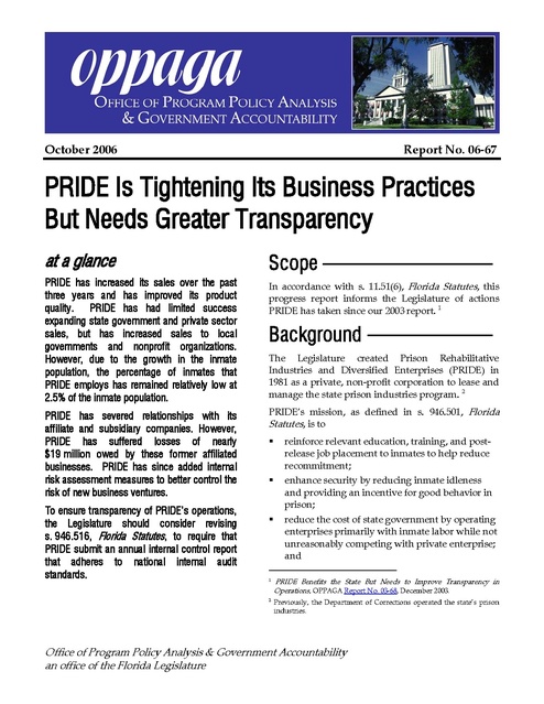 October 2006 Report No. 06-67 PRIDE Is Tightening Its Business Practices But Needs Greater Transparency at a glance Scope ___________________ PRIDE has increased its sales over the past three years and has improved its product quality. PRIDE has had limited success expanding state government and private sector sales, but has increased sales to local governments and nonprofit organizations. However, due to the growth in the inmate population, the percentage of inmates that PRIDE employs has remained relatively low at 2.5% of the inmate population. In accordance with s. 11.51(6), Florida Statutes, this progress report informs the Legislature of actions PRIDE has taken since our 2003 report. 1 PRIDE has severed relationships with its affiliate and subsidiary companies. However, PRIDE has suffered losses of nearly $19 million owed by these former affiliated businesses. PRIDE has since added internal risk assessment measures to better control the risk of new business ventures. PRIDE’s mission, as defined in s. 946.501, Florida Statutes, is to To ensure transparency of PRIDE’s operations, the Legislature should consider revising s. 946.516, Florida Statutes, to require that PRIDE submit an annual internal control report that adheres to national internal audit standards. Background ______________ The Legislature created Prison Rehabilitative Industries and Diversified Enterprises (PRIDE) in 1981 as a private, non-profit corporation to lease and manage the state prison industries program. 2 reinforce relevant education, training, and postrelease job placement to inmates to help reduce recommitment; enhance security by reducing inmate idleness and providing an incentive for good behavior in prison; reduce the cost of state government by operating enterprises primarily with inmate labor while not unreasonably competing with private enterprise; and 1 PRIDE Benefits the State But Needs to Improve Transparency in Operations, OPPAGA Report No. 03-68, December 2003. 2 Previously, the Department of Corrections operated the state’s prison industries. Office of Program Policy Analysis & Government Accountability an office of the Florida Legislature OPPAGA Report Report No. 06-67 rehabilitate inmates by duplicating, as nearly as possible, the activities of a profit-making enterprise. sales had been falling, as had the number of workstations. We recommended that PRIDE PRIDE supports the state correctional system in several ways by reducing inmate idleness, providing incentives for good behavior, facilitating payment of restitution, and providing useful vocational skills to inmates that may help to reduce recidivism. In 2005, PRIDE operated 36 industries, including raising dairy calves, building office furniture, providing printing and document imaging services, and manufacturing service garments. 3 (Appendix A describes PRIDE’s 36 industries.) Current Status increase sales to generate funds for more workstations; work with state and local government purchasing officers to identify goods and services that PRIDE could produce for them; refine customer service and quality control to remedy customer complaints; and work with Enterprise Florida to identify ways that PRIDE programs could be used to enhance the attractiveness of the state to business and increase PRIDE sales. PRIDE’s sales have increased but its proportion of workstations to inmates has declined slightly. __________ According to PRIDE’s executives, PRIDE’s ability to increase workstations is dependent on its sales. Over the last four years, PRIDE has been successful selling its products. As shown in Exhibit 1, PRIDE sales grew 10% between 2003 and 2005. To fulfill these increased product orders, PRIDE increased the number of inmate hours worked during this period by 12%, from 3.6 million hours in 2002 to 4.1 million hours in 2005. PRIDE has made progress addressing the issues raised in our previous reports, although it did not fully implement all of our recommendations. Since our report, PRIDE has increased sales, but has not increased workstations commensurate with increased sales. PRIDE has worked with state agency purchasing officers to identify products and improve customer service. However, PRIDE has not yet successfully worked with Enterprise Florida to find ways to increase business with the private sector. PRIDE has severed its ties with its former subsidiaries to eliminate conflicts of interest, but it lost nearly $19 million from its association with these entities. PRIDE has added risk assessment and internal control measures to better assess the risk of new business ventures. Exhibit 1 PRIDE Sales Have Increased in Recent Years $71.9M $64.7M $65.7M 2003 2004 While PRIDE has increased sales and improved product quality, it has had limited success expanding private sector sales Our 2003 report concluded that PRIDE programs enhance prison security and increase opportunities for inmates to find gainful employment upon release. However, PRIDE 3 Source: PRIDE. The required skill and educational levels vary across industries as well as by position, though most PRIDE jobs require at least a sixth-grade education. All industries provide job-specific training. 2 2005 Report No. 06-67 OPPAGA Report As shown in Exhibit 2, PRIDE also has increased its inmate workstations slightly in recent years, from 2,049 to 2,117. Workstations are the number of inmates that can be employed at any time. However, due to the growth in the inmate population, the proportion of workstations to inmates fell slightly over this period. Compared to other states’ prison industry programs, PRIDE has a lower proportion of workstations to inmates. The National Correctional Industries Association reports that of states with the highest numbers of inmates in 2005, the nationwide proportion of state prison industry workstations to inmates is approximately 3.7%, compared to 2.5% in Florida. 4 PRIDE has increased sales to state agencies and addressed product and cu