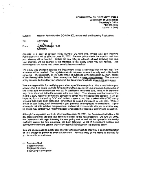 Reissue of Policy, DC-ADM 803, '"Inmate Mail and Incoming Publications" Memo