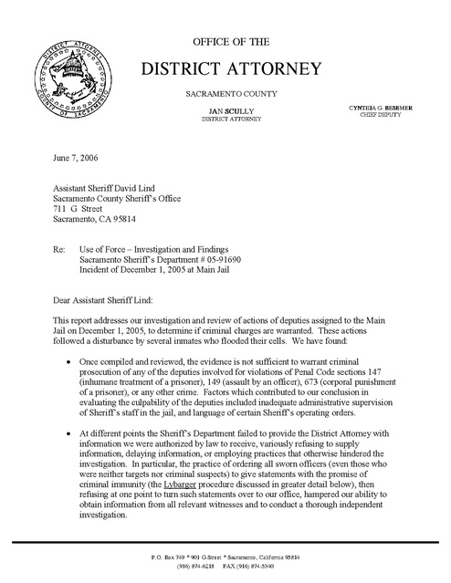 OFFICE OF THE DISTRICT ATTORNEY SACRAMENTO COUNTY JAN SCULLY DISTRICT ATTORNEY CYNTHIA G. BESEMER CHIEF DEPUTY June 7, 2006 Assistant Sheriff David Lind Sacramento County Sheriff’s Office 711 G Street Sacramento, CA 95814 Re: Use of Force – Investigation and Findings Sacramento Sheriff’s Department # 05-91690 Incident of December 1, 2005 at Main Jail Dear Assistant Sheriff Lind: This report addresses our investigation and review of actions of deputies assigned to the Main Jail on December 1, 2005, to determine if criminal charges are warranted. These actions followed a disturbance by several inmates who flooded their cells. We have found: • Once compiled and reviewed, the evidence is not sufficient to warrant criminal prosecution of any of the deputies involved for violations of Penal Code sections 147 (inhumane treatment of a prisoner), 149 (assault by an officer), 673 (corporal punishment of a prisoner), or any other crime. Factors which contributed to our conclusion in evaluating the culpability of the deputies included inadequate administrative supervision of Sheriff’s staff in the jail, and language of certain Sheriff’s operating orders. • At different points the Sheriff’s Department failed to provide the District Attorney with information we were authorized by law to receive, variously refusing to supply information, delaying information, or employing practices that otherwise hindered the investigation. In particular, the practice of ordering all sworn officers (even those who were neither targets nor criminal suspects) to give statements with the promise of criminal immunity (the Lybarger procedure discussed in greater detail below), then refusing at one point to turn such statements over to our office, hampered our ability to obtain information from all relevant witnesses and to conduct a thorough independent investigation. P.O. Box 749 * 901 G Street * Sacramento, California 95814 (916) 874-6218 FAX (916) 874-5340 Page 2 I. REVIEW PROCESS The District Attorney’s Office conducted its investigation and review as an independent agency. Our investigation included the interview of witnesses, and the review of written reports and other documentary items, including: Sheriff’s casualty reports, jail incident reports (PF10 computer screen reports) and supplemental reports; video recording of the cell extractions; photographs; interviews of inmates, and Sheriff’s personnel; District Attorney investigative reports and supplements, diagrams and logs; Sheriff’s Office personnel files; Sheriff’s Department Operations Orders; inmate incident reports; documentation on the technical data of flash-bang tactical grenades; Sheriff’s diversionary devices training information; and legal authorities relating to the use of force by law enforcement officials in a custodial setting. In reviewing the materials, internal inconsistencies contained in the witnesses’ statements and discrepancies between various witnesses’ statements were considered. We also considered what each witness was able to see, hear or otherwise perceive as established by the audio/visual record. The criminal histories of the involved inmates were also reviewed to evaluate credibility. We considered Sheriff’s Department policies and procedures as they related to the “use of force” tactics employed by deputies on December 1, 2005. We do not address issues of civil liability. II. FACTUAL SUMMARY In the Main Jail, 400 pod (located on 8 Floor West) is used to house inmates who are particularly dangerous or disruptive. The area has cells on both an upper and a lower tier. On December 1, 2006, shortly after 7:30 p.m., deputies noticed water flowing over the upper tier walkway and draining onto the main floor of the pod as a result of cell flooding. [Cell flooding occurs when inmates leave the water running after plugging the toilet and sink drains in their cells and is not an uncommon occurrence in the jail]. Deputies shut off the water to the offending cells, and put magnetic covers over the cell door windows. The inmates began yelling and kicking their cell doors. Five inmates on the upper tier were determined to be responsible. Three were being held on murder charges, one was pending multiple robbery counts, and one was pending drug charges. The acting Watch Commander, Sgt. Donald Black, directed that a Custody Emergency Response Team (CERT) be used to extract the inmates from their cells. Following assembly and briefing, the team arrived at 8 Floor West shortly before 8:30 p.m. Sgt. Black personally led and directed the extractions. One cell at a time, each inmate was directed to lie down on the floor of his cell. In a matter of seconds, the feeding port was then opened and a flash-bang grenade (designed to briefly stun and disorient, but not to cause injury) was inserted into the cell. After the flash-bang went off, each cell was opened and a team entered, physically subdued the inmate, and took him to the lower level. The inmates were not afforded an opportunity to submit to handcuffing through the food port nor to voluntarily leave their cells. Ultimately, the five inmates on the upper tier, and one inmate on the lower tier who began yelling and inciting others, were subjected to this procedure. After the extraction, each inmate was placed in a prostraint chair for a period of time, then relocated to a different cell. The extraction process was video recorded for the first five extractions but, due to battery failure, the sixth extraction was not video recorded. Page 3 Three inmates suffered only minor bruising or “complaint of pain” type injuries. Inmate Michael Toro suffered a chin laceration and a fractured nose. Inmate Jason Morrison suffered flesh burns to his upper left chest and arm. Inmate Daniel Lucas suffered burns to his upper inner thighs. In addition, inmate Jessie Kerwin had powder burns on his pants near the right hip and upper thigh. The burn or powder burn evidence on the per