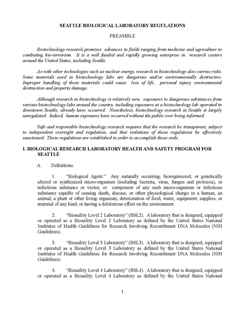 SEATTLE BIOLOGICAL LABORATORY REGULATIONS PREAMBLE Biotechnology research promises advances in fields ranging from medicine and agriculture to combating bio-terrorism. It is a well funded and rapidly growing enterprise in research centers around the United States, including Seattle. As with other technologies such as nuclear energy, research in biotechnology also carries risks. Some materials used in biotechnology labs are dangerous and/or environmentally destructive. Improper handling of those materials could cause loss of life, personal injury, environmental destruction and property damage. Although research in biotechnology is relatively new, exposures to dangerous substances from various biotechnology labs around the country, including exposures at a biotechnology lab operated in downtown Seattle, already have occurred. Nonetheless, biotechnology research in Seattle is largely unregulated. Indeed, human exposures have occurred without the public ever being informed. Safe and responsible biotechnology research requires that the research be transparent, subject to independent oversight and regulation, and that violations of those regulations be effectively sanctioned. These regulations are established in order to accomplish those ends. I. BIOLOGICAL RESEARCH LABORATORY HEALTH AND SAFETY PROGRAM FOR SEATTLE A. Definitions. 1. “Biological Agent.” Any naturally occurring, bioengineered, or genetically altered or synthesized micro-organism (including bacteria, virus, fungus and protozoa), or infectious substance or vector, or component of any such micro-organism or infectious substance capable of causing death, disease, or other physiological change in a human, an animal, a plant or other living organism; deterioration of food, water, equipment, supplies, or material of any kind; or having a deleterious effect on the environment. 2. “Biosafety Level 2 Laboratory” (BSL2). A laboratory that is designed, equipped or operated as a Biosafety Level 2 Laboratory as defined by the United States National Institutes of Health Guidelines for Research Involving Recombinant DNA Molecules (NIH Guidelines). 3. “Biosafety Level 3 Laboratory” (BSL3). A laboratory that is designed, equipped or operated as a Biosafety Level 3 Laboratory as defined by the United States National Institutes of Health Guidelines for Research Involving Recombinant DNA Molecules (NIH Guidelines). 4. “Biosafety Level 4 Laboratory” (BSL4). A laboratory that is designed, equipped or operated as a Biosafety Level 4 Laboratory as defined by the United States National 1 Institutes of Health Guidelines for Research Involving Recombinant DNA Molecules (NIH Guidelines). 5. County. “BOH.” King County Board of Health, aka Public Health - Seattle & King 6. “Facility.” A building or combination of buildings under common control and ownership containing one or more laboratories subject to a common Institutional Biosafety Committee (as defined in Section II, infra). 7. “Laboratory.” A room or rooms used primarily for biological research, development, non-routine testing, or experimentation activity, or any room or rooms where vertebrate animals are contained under animal biosafety levels described in NIH Guidelines. The word laboratory also includes all enclosed areas with a laboratory containment area, including any rooms, closets, facilities, freezers, refrigerators or incubators where biological agents are stored, fermented, grown, proliferated or colonized. 8. "Research Sponsor." Any State, public or private corporation or authority, any individual, trust, firm, joint stock company, LLC, partnership, research group, task force, university program, association, or entity or any group thereof, any group of persons, and any agency or political subdivision of the State of Washington, the federal government or any other government, subdivision, agent or agency thereof, which operates or which proposes to operate a BSL2 and/or BSL3 laboratory in Seattle. 9. “Principal Investigator.” The individual designated by a Research Sponsor to direct the biological research project or program the Research Sponsor conducts at biosafety laboratory levels 2 or 3, who is responsible to the Research Sponsor for the scientific and technical direction of that project or program. 10. “Toxin.” Any toxic material or product of plants, animals, micro-organisms (including bacteria, virus, fungus, rickettsia, or protozoa), misfolded protein, infectious substance, or a recombinant or synthesized molecule, whatever its origin or method of production. “Toxin” includes: any poisonous substance or biological product that may be engineered as a result of biotechnology produced by a living organism; or any poisonous isomer or biological product, homolog, or derivative of such substance. B. There shall be established in the BOH, a High Containment Biological Research Laboratory Health and Safety Program (“the Program”) for BSL2 &3 laboratories located in Seattle. 1. The Program shall provide standards for location, operation, and maintenance of High Containment Biological Research Laboratories and the oversight of such laboratories to protect the safety of laboratory workers, the public, and the environment from regulated agents and toxins. 2. The Program shall provide standards for the transportation, relocation, shipment, delivery, conveyance and receipt of regulated agents and toxins. 2 3. The Program shall provide for procedures which would allow the BOH to order a Biosafety Laboratory Levels 2 through 3 to immediately cease and desist work on a project(s) and lock down and/or refrain from any activity that the BOH determines could cause immediate and irreparable injury, loss or damage. 4. The Program shall be administered by the Seattle Biosafety Committee defined below. C. The BOH shall adopt regulations for the implementation of the Program that establish the criteria for determining appropriate locations for siting a building o