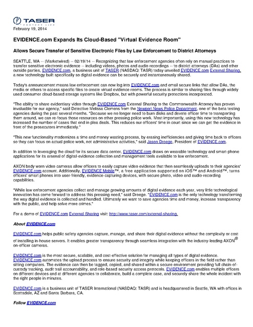 February 19, 2014 EVIDENCE.com Expands Its Cloud-Based "Virtual Evidence Room" Allows Secure Transfer of Sensitive Electronic Files by Law Enforcement to District Attorneys SEATTLE, WA -- (Marketwired) -- 02/19/14 -- Recognizing that law enforcement agencies often rely on manual practices to transfer sensitive electronic evidence -- including videos, photos and audio recordings -- to district attorneys (DAs) and other outside parties, EVIDENCE.com, a business unit of TASER (NASDAQ: TASR) today unveiled EVIDENCE.com External Sharing, a new technology built specifically so digital evidence can be securely and instantaneously shared. Today's announcement means law enforcement can now log into EVIDENCE.com and email secure links that allow DAs, the media or others to access specific files to create virtual evidence rooms. The process is similar to sharing files through widely used consumer cloud-based storage systems like Dropbox, but with powerful security protections incorporated. "The ability to share evidentiary video through EVIDENCE.com External Sharing to the Commonwealth Attorney has proven invaluable for our agency," said Detective Melissa Clemens from the Newport News Police Department, one of the beta testing agencies during the past several months. "Because we no longer need to burn disks and devote officer time to transporting them around, we can re-focus those resources on other pressing police work. Most importantly, using this new technology has increased the number of cases that end in plea deals. This reduces our officers' time in court since we can get the evidence in front of the prosecutors immediately." "This new functionality modernizes a time and money wasting process, by erasing inefficiencies and giving time back to officers so they can focus on actual police work, not administrative activities," said Jason Droege, President of EVIDENCE.com. In addition to leveraging the cloud for its secure data center, EVIDENCE.com draws on wearable technology and smart-phone applications for its arsenal of digital-evidence collection and management tools available to law enforcement. AXON body worn video cameras allow officers to easily capture video evidence that then seamlessly uploads to their agencies' EVIDENCE.com account. Additionally, EVIDENCE Mobile™, a free application supported on iOS™ and Android™, turns officers' smart phones into user-friendly, evidence-capturing devices, with secure photo, video and audio-recording capabilities. "While law enforcement agencies collect and manage growing amounts of digital evidence each year, very little technological innovation has come forward to address this pressing need," said Droege. "EVIDENCE.com is the only technology transforming the way digital evidence is collected and handled. Ultimately we want to save agencies time and money, increase transparency with the public, and help solve more crimes." For a demo of EVIDENCE.com External Sharing visit: http://www.taser.com/external-sharing. About EVIDENCE.com EVIDENCE.com helps public safety agencies capture, manage, and share their digital evidence without the complexity or cost ® of installing in-house servers. It enables greater transparency through seamless integration with the industry-leading AXON on-officer cameras. EVIDENCE.com is the most secure, scalable, and cost-effective solution for managing all types of digital evidence. EVIDENCE.com automates the upload process to ensure security and integrity while keeping officers in the field rather than sitting computers. The evidence can then be tagged, copied, and shared within a secure environment providing full chain-ofcustody tracking, audit trail accountability, and role-based security access protocols. EVIDENCE.com enables multiple officers on different devices and at different agencies to collaborate, build a complete case, and securely share the whole incident with the right people in minutes. EVIDENCE.com is a business unit of TASER International (NASDAQ: TASR) and is headquartered in Seattle, WA with offices in Scottsdale, AZ and Santa Barbara, CA. Follow EVIDENCE.com ● ● Facebook: https://www.facebook.com/EVIDENCEcom Twitter: http://www.twitter.com/EVIDENCEcom About TASER International, Inc. TASER protects life: TASER Conducted Electrical Weapons (CEWs) have saved more than 120,000 lives from potential death or serious injury. TASER protects truth: We enable greater transparency with the industry-leading TASER CAM and AXON on officer camera systems. Together with our customers, we are defining the future of smart policing by connecting intelligent devices and sensors with the first secure cloud-based digital evidence management solution for law enforcement: EVIDENCE.com. Since 1994, more than 260,000 private individuals have relied on TASER technology to protect themselves and their loved ones. Learn more about TASER and its solutions at www.TASER.com and www.EVIDENCE.com or by calling (800) 978-2737. ® TASER is a registered trademark of TASER International, Inc., registered in the U.S. All rights reserved. TASER logo, ® ® TASER CAM™, AXON and EVIDENCE Mobile™ are trademarks of TASER International, Inc. Note to Investors Please visit http://investor.taser.com, http://blog.taser.com, www.twitter.com/taser_ir, www.twitter.com/officialtaser and https://www.facebook.com/TASER.International where TASER discloses information from time to time about the company, its financial information, and its business. Visit our Investor Relations Safe Harbor Statement at: investor.taser.com/safeHarbor.cfm For investor relations information please contact Erin Curtis by phone at 480-515-6330 or via email at IR@TASER.com. Embedded Video Available CONTACT: Steve Tuttle Vice President of Communications TASER International, Inc. Media ONLY Hotline: (480) 444-4000 Email Contact Source: TASER International News Provided by Acquire Media