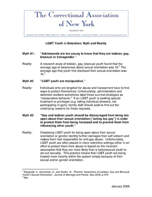 The Correctional Association of Ny Publication Lgbt Myths and Reality Jan 2006