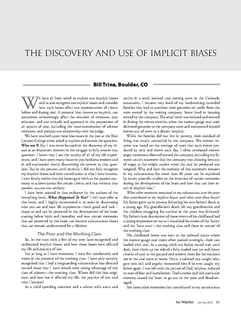 The Discovery and Use of Implicit Biases Bill Trine, Boulder, CO W e have all been asked to explore our implicit biases and to also recognize our explicit biases and consider how such biases affect our representation of clients before and during trial. A personal bias, known or implicit, can sometimes unknowingly affect the selection of witnesses, jury selection, and our attitude and approach in the preparation of all aspects of trial, including the cross-examination of adverse witnesses, and perhaps our relationship with the judge. We have touched upon these bias issues in the past at the Trial Lawyers College when asked to explore and answer the question: Who am I? But I was never focused on the discovery of my biases as an important element in the struggle to fully answer that question. I know that I am the totality of all of my life experiences, and I have spent many hours in psychodrama sessions and in self-exploration slowly discovering the answer to that question. But in the process, until recently, I did not fully recognize my implicit biases and their contribution to who I have become. I now finally realize that my biases gave birth to the passion necessary to achieve justice for certain clients, and that without that passion, success was unlikely. I have been assisted in that endeavor by the authors of the bestselling book, What Happened To You?1 I will later refer to this book, and I highly recommend it to assist in discovering who you are and how life experiences—both good and bad--shape us and can be preserved in the development of the brain starting before birth and thereafter, and how certain memories that are preserved by the brain can become subconscious biases that can remain undiscovered for a lifetime. The Poor and the Working Class So, let me start with a few of my own later-recognized and understood implicit biases, and how those biases have affected my life and practice of law. For as long as I have memories, I have felt comfortable and warm in the presence of the working class. I have only recently recognized that I had a longstanding subconscious bias directed toward those that I have sensed were taking advantage of this class of citizens—the working class. Where did this bias originate, and how has it affected my life, the practice of law, and who I became? As a child spending summers and a winter with aunts and uncles in a small isolated coal mining town in the Colorado mountains, I became very fond of my hardworking extended families that had to purchase their groceries on credit from the store owned by the mining company. Some lived in housing owned by the company. The small town was isolated and snowed in during the winter months, when the narrow-gauge coal train delivered groceries to the company store and transported injured miners out of town to a distant hospital. While the families did not live in poverty, their standard of living was totally controlled by the company. The miners’ income was based on the tonnage of coals that each miner produced by pick and shovel each day. I often overheard miners’ angry statements directed toward the company, including my favorite uncle’s statement that the company was cheating him out of wages at the weight station when the coal he produced was weighed. Why and how the memory of this statement remains in my subconscious for more than 80 years can be explained by recent scientific studies on the retention of certain memories during the development of the brain and how that can then result in implicit bias.2 What other memories remained in my subconscious over the years that contributed to my implicit biases, and what were those biases? My father grew up in poverty following his own father’s death at a young age. My grandfather’s death left my grandmother and the children struggling for survival in the years that followed. My father’s later description of those events of his childhood had a lasting impression on me as I visualized his stories of the ‘haves’ and the ‘have nots’—the working class and those in control of the working class. His childhood home was next to the railroad tracks where the narrow-gauge coal trains often parked overnight, their cars loaded with coal. As a young child, my father would wait until dark, then climb up the side of a fully loaded coal car and throw chunks of coal to the ground and retrieve them for his mother’s use in the coal stove at home. Once, a railroad cop caught him, gave him hell and angrily threatened him if he ever caught my father again. I was left with the picture of Dad, helpless, reduced to tears of fear and humiliation. Dad’s stories and this particular memory caused my heart to go out to the poor and disadvantaged. Are there other memories that contributed to my unconscious The Warrior Spring 2022 51 The Discovery and Use of Implicit Biases biases that favored the poor and working classes and made those that harmed them the enemy? There are many, both from my childhood and in the years that followed. I will describe a few that I now recognize had a longstanding effect on how I eventually practiced law, and the type of cases that created a passion in my representation of certain clientele. The Catholic Church My best friend in grade school, Lynn Griffith, was the youngest in an impoverished family of 16 children who lived across the railroad tracks from me in Grand Junction, Colorado. His struggling father used his children to help him deliver coal to residences in town using an old broken-down truck. Lynn and I did everything together—hunted rabbits with slingshots, climbed buildings looking for pigeon nests, sold the local newspaper after school each day in bars and restaurants and to troops on the troop trains carrying soldiers destined for World War II. Lynn questioned why my mother made me and my sister, Adrienne, go to the Catholic Church each Sunday without her, and I explained that Catholics went to church to confess their sins and