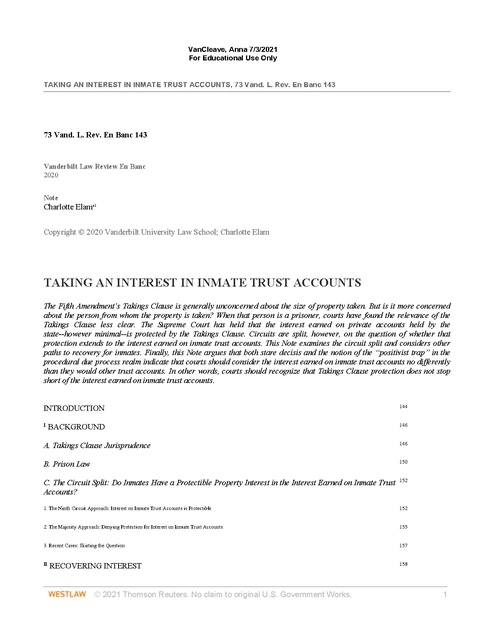 VanCleave, Anna 7/3/2021 For Educational Use Only TAKING AN INTEREST IN INMATE TRUST ACCOUNTS, 73 Vand. L. Rev. En Banc 143 73 Vand. L. Rev. En Banc 143 Vanderbilt Law Review En Banc 2020 Note Charlotte Elama1 Copyright © 2020 Vanderbilt University Law School; Charlotte Elam TAKING AN INTEREST IN INMATE TRUST ACCOUNTS The Fifth Amendment’s Takings Clause is generally unconcerned about the size of property taken. But is it more concerned about the person from whom the property is taken? When that person is a prisoner, courts have found the relevance of the Takings Clause less clear. The Supreme Court has held that the interest earned on private accounts held by the state--however minimal--is protected by the Takings Clause. Circuits are split, however, on the question of whether that protection extends to the interest earned on inmate trust accounts. This Note examines the circuit split and considers other paths to recovery for inmates. Finally, this Note argues that both stare decisis and the notion of the “positivist trap” in the procedural due process realm indicate that courts should consider the interest earned on inmate trust accounts no differently than they would other trust accounts. In other words, courts should recognize that Takings Clause protection does not stop short of the interest earned on inmate trust accounts. INTRODUCTION 144 BACKGROUND 146 I. A. Takings Clause Jurisprudence 146 B. Prison Law 150 C. The Circuit Split: Do Inmates Have a Protectible Property Interest in the Interest Earned on Inmate Trust Accounts? 152 1. The Ninth Circuit Approach: Interest on Inmate Trust Accounts is Protectible 152 2. The Majority Approach: Denying Protection for Interest on Inmate Trust Accounts 155 3. Recent Cases: Skirting the Question 157 II. RECOVERING INTEREST WESTlAW © 2021 Thomson Reuters. No claim to original U.S. Government Works. 158 1 VanCleave, Anna 7/3/2021 For Educational Use Only TAKING AN INTEREST IN INMATE TRUST ACCOUNTS, 73 Vand. L. Rev. En Banc 143 A. Inmate Trust Accounts 158 1. Why Interest Differs from Other Deductions 158 2. Statutory Distinctions 159 B. Takings Analysis 161 1. Protectible Property Interest? 161 a. The Interest Constitutes a Protectible Property Interest 161 b. Arguments Against Finding a Protectible Property Interest 164 2. Just Compensation 165 C. Other Avenues to Recovery 167 1. Federal Procedural Due Process Clause 167 2. State Constitutional Provisions 169 a. State Takings Clauses 170 b. Prisoner-specific Provisions 172 III. TAKING AWAY THE POSITIVIST TRAP CONCLUSION 173 176 *144 INTRODUCTION Eddie’s mother forgoes paying her bills to send a money order to her son in Virginia’s Bland Correctional Center.1 What Eddie does not spend on toothpaste, toilet paper, and perhaps an appointment with the doctor, he places in a compulsory savings account.2 When he is released from incarceration following a twenty-year sentence, Eddie can bring the remaining funds with him.3 In the meantime, interest accrues on his account.4 But Eddie will not be able to add the earned interest to the sum he brings back home; instead, the interest will benefit the Department of Corrections.5 Eddie’s situation is not uncommon. The majority of states have widened opportunities for inmates to earn or receive money while behind bars.6 Approximately half of the 2.3 million individuals incarcerated in the United States work for private or state-owned businesses, in work-release programs, or, most commonly, in prison jobs *145 supporting the facilities.7 Outside of Alabama, Arkansas, Florida, Georgia, and Texas, inmates often can earn wages8--on average, a maximum daily wage of $3.45.9 Furthermore, inmates can receive funds from friends and family members or through benefits like Social Security, Veterans Administration (“VA”) payments, or workers’ compensation.10 For safety reasons, the vast majority of prisons prohibit inmates from carrying money on their persons.11 As such, many Departments of Corrections (“DOCs”) utilize some form of account system for inmates to deposit their funds.12 Prison authorities generally have wide latitude over the management of these funds, such that they are able to deduct various fees and costs according to their policies.13 Nevertheless, the ability to accumulate funds during incarceration can make a WESTlAW © 2021 Thomson Reuters. No claim to original U.S. Government Works. 2 VanCleave, Anna 7/3/2021 For Educational Use Only TAKING AN INTEREST IN INMATE TRUST ACCOUNTS, 73 Vand. L. Rev. En Banc 143 significant difference for an inmate, who can purchase snacks, hygiene products, or phone cards at the prison canteen while building savings to ease the transition to life outside prison walls.14 Some of these statutory programs require inmate funds to be pooled together so that the total amount can generate interest.15 While a state may provide inmates the ability to receive their proportionate share of the interest, minus the costs of maintaining the account,16 most do not. Rather, most state statutes allow their DOCs to spend the interest elsewhere, typically on a common fund benefiting general prisoner welfare.17 *146 The question of whether state and federal DOCs’ appropriation of the interest earned on inmate trust accounts constitutes a taking without just compensation in violation of the Fifth Amendment of the U.S. Constitution has divided courts since the early 2000s.18 More specifically, courts disagree as to whether inmates even have a protectible property interest in the interest earned on their savings accounts.19 The First, Fourth, and Eleventh Circuits have denied the existence of such a right,20 but the Ninth Circuit has recognized a protectible property right in the interest earned on inmate trust accounts given the common-law principle that “interest follows principal.”21 The Ninth Circuit’s determination trailed behind two Supreme Court decisions holding that the “interest follows principal